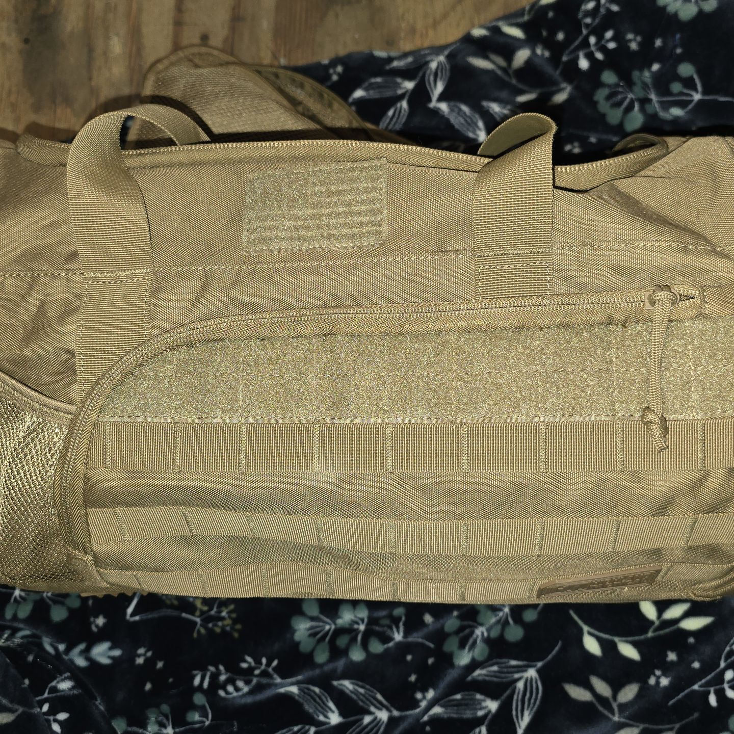 Never used brown/tan tactical duffle bag. Its sturdy, holds a lot and has multiple compartments. I have found another bag to use that fit my needs. $25 OBO or trades. No low ballers