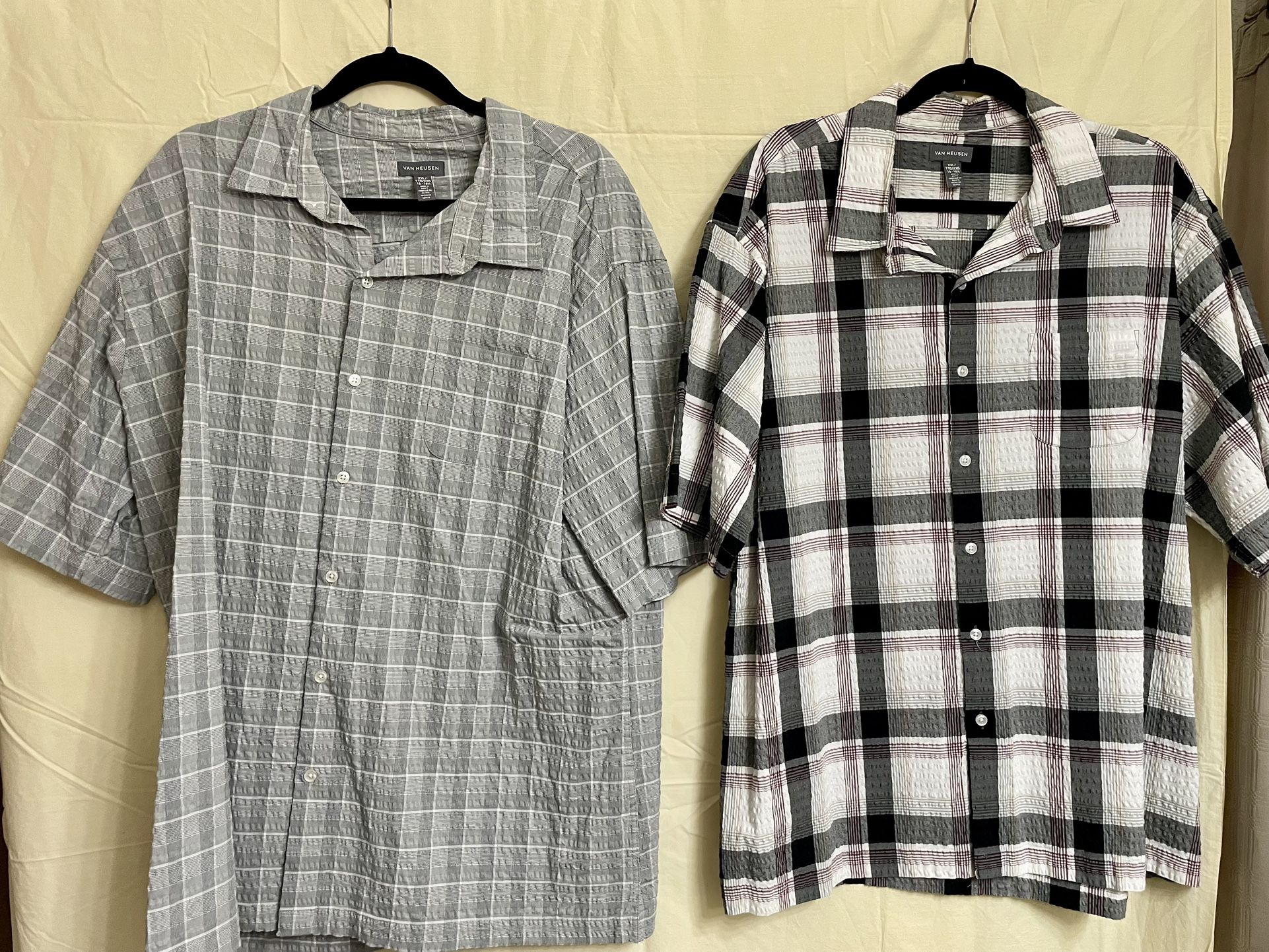 Men’s van heusen short sleeve button up shirts includes two in the color of gray and black and white plaid lightweight and comfortable grateful warm weather casual wear or work size double X in excellent condition no holes no damage. Smoke free home.