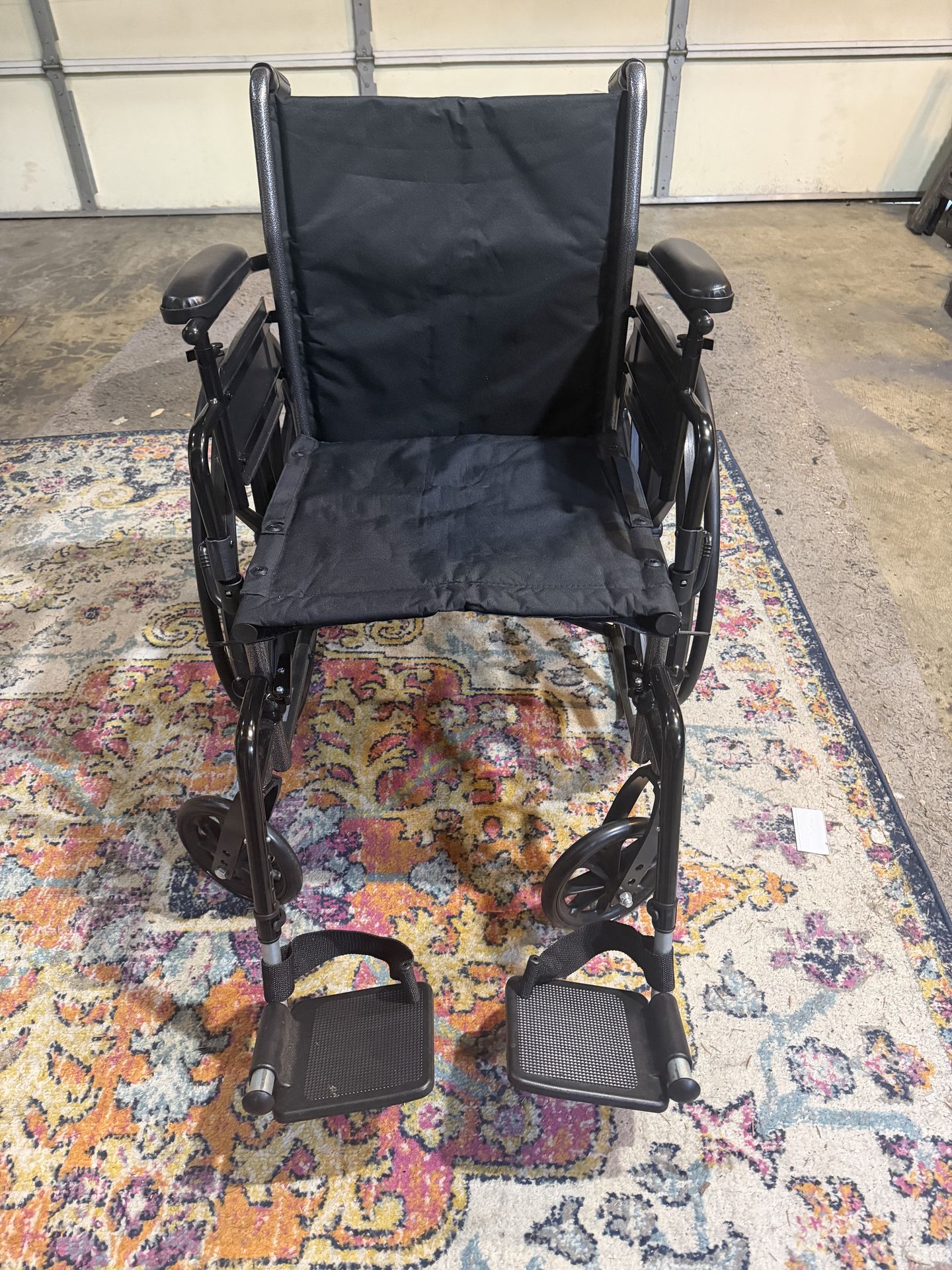 Seat is 18 inches wide Foldable feet placement with ankle support straps. New, not used wheelchair. Had surgery and didn’t need it.