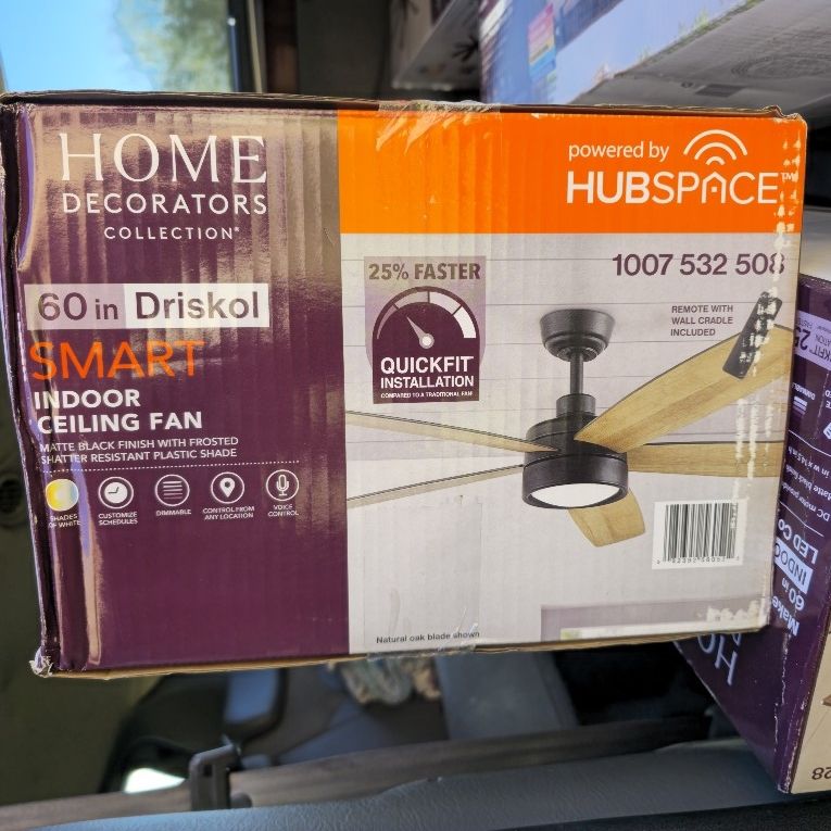 Brand new 60" Home Decorators Driskol smart ceiling fan – never installed, box still sealed. Retail is around $249, letting you save money and still get a high‑end smart fan. ���Matte black with natural oak style bladesIntegrated dimmable LED light, adjustable white color (warm to daylight) ��Remote control and wall cradle includedWorks with Hubspace app, Alexa, and Google Assistant for smart control ��Quiet DC motor, multiple speeds, reverse mode for year‑round comfort ��Deals:Local pickup (Phoenix/Scottsdale): $150 OBO – cash preferredPhoenix valley delivery: $170 (I can drop it off at your house or job site)If the ad is up, it’s available. Tap “Make Offer” or message me your pickup time and if you need delivery.