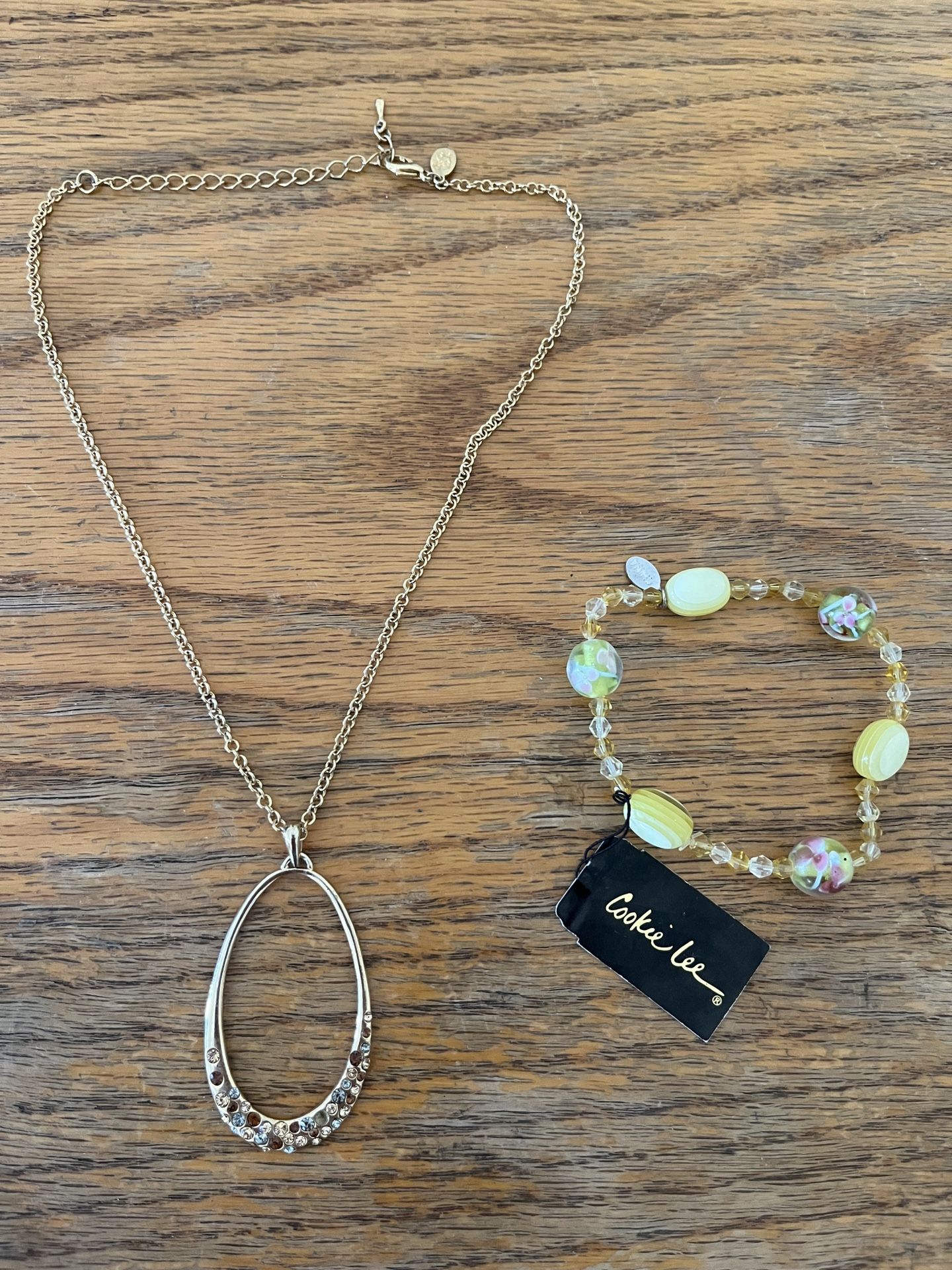 High desert newer Adelanto pick up- $15 on both or $8 each, New Cookie Lee Pretty Mostly Yellow / Clear Glass Beads Bracelet & Slight Used Nice Large Gold Tone Loop Pendant with different colorful stones but missing 1 tiny stone barely able to see in picture. I think chain link necklace is 16” Long & can wear shorter as doesn’t have tag like bracelet does but yellow tone is perfect condition, $8 each or $15 for both of them.