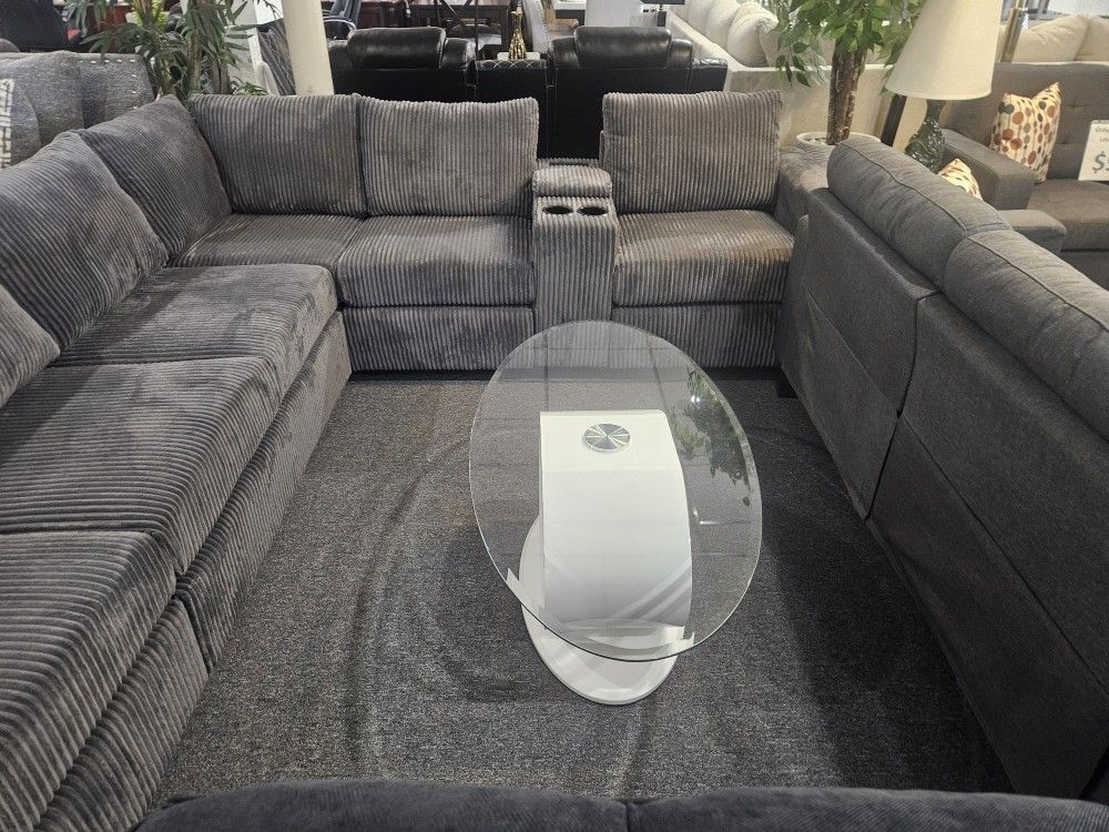 Brand New Dark Gray Corduroy Sectional With Cup Holdera And Charging Ports (125" x 85")