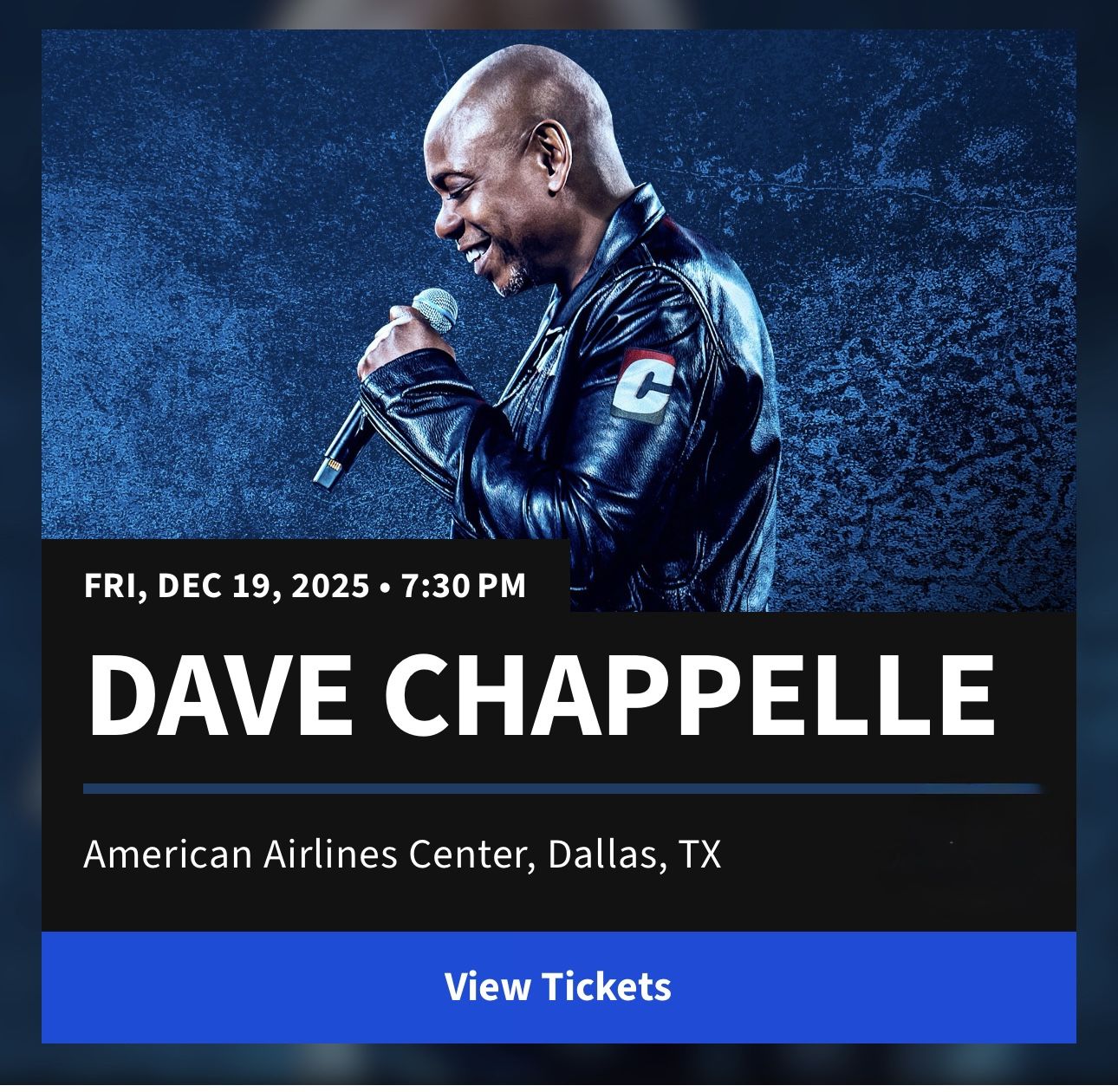 I have 2 available tickets for Dave Chappelle performing at American Airlines Center for Friday December 19th 2025. They are in section 120 Row H. These seats are together. Selling each ticket for $350. No tax or ticket fees. These are mobile tickets through Ticketmaster & I can meet you for transfer if needed. 2 - Section 120 Row H $350 each.