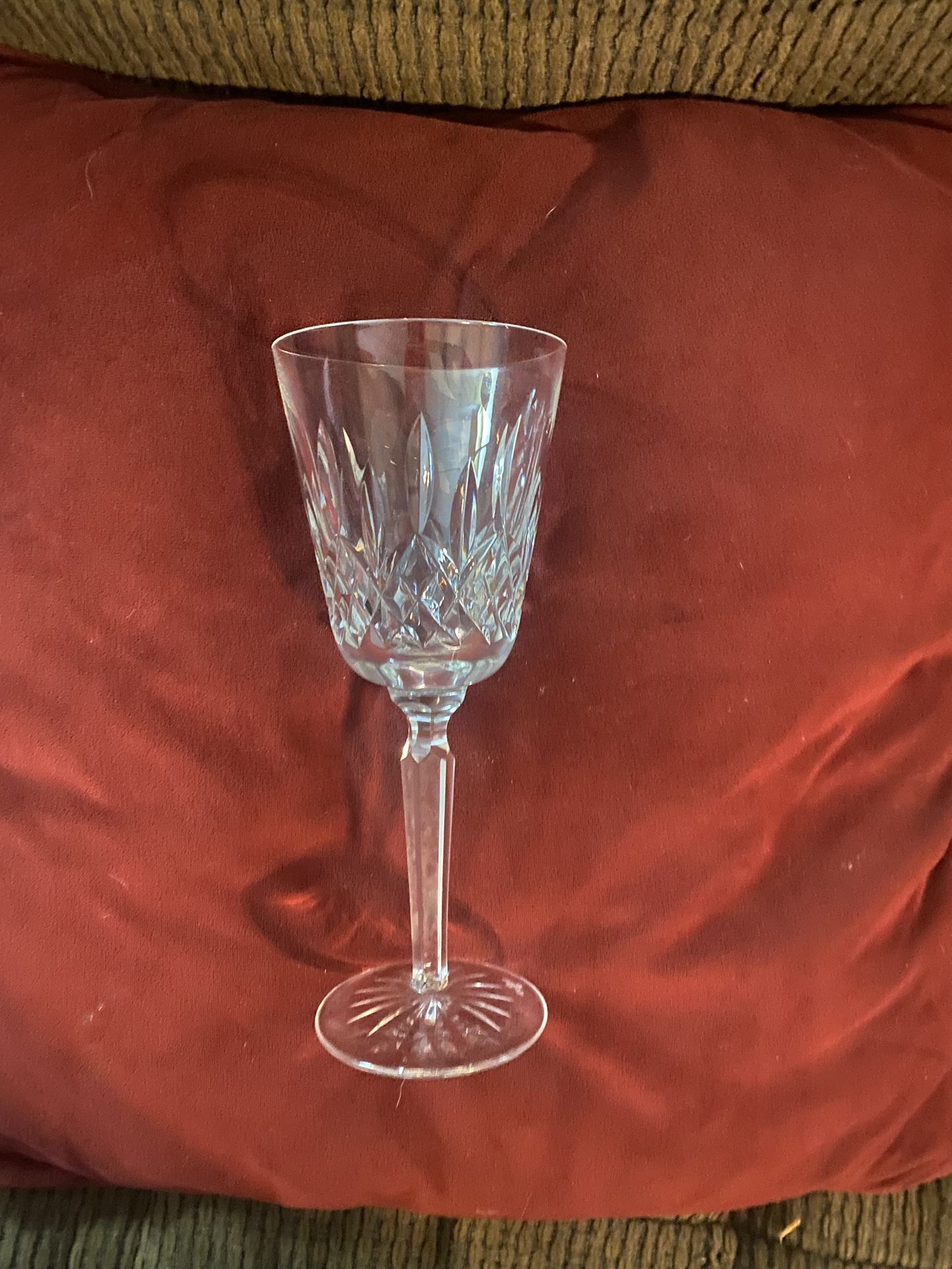 Waterford Lismore crystal wine glass. This iconic pattern, created in 1952, is known for its combination of brilliance and clarity, featuring signature diamond and wedge cuts. 8 1/4 x 3 1/2 wide These are typically used for serving wine, water, or juices. � * Vintage versions of this glass might be priced around $90 per stem on platforms like eBay. � * The Lismore pattern is inspired by the Gothic architecture of Lismore Castle in Ireland. $70 per stem. I have 11 of these available. Thank you for looking.