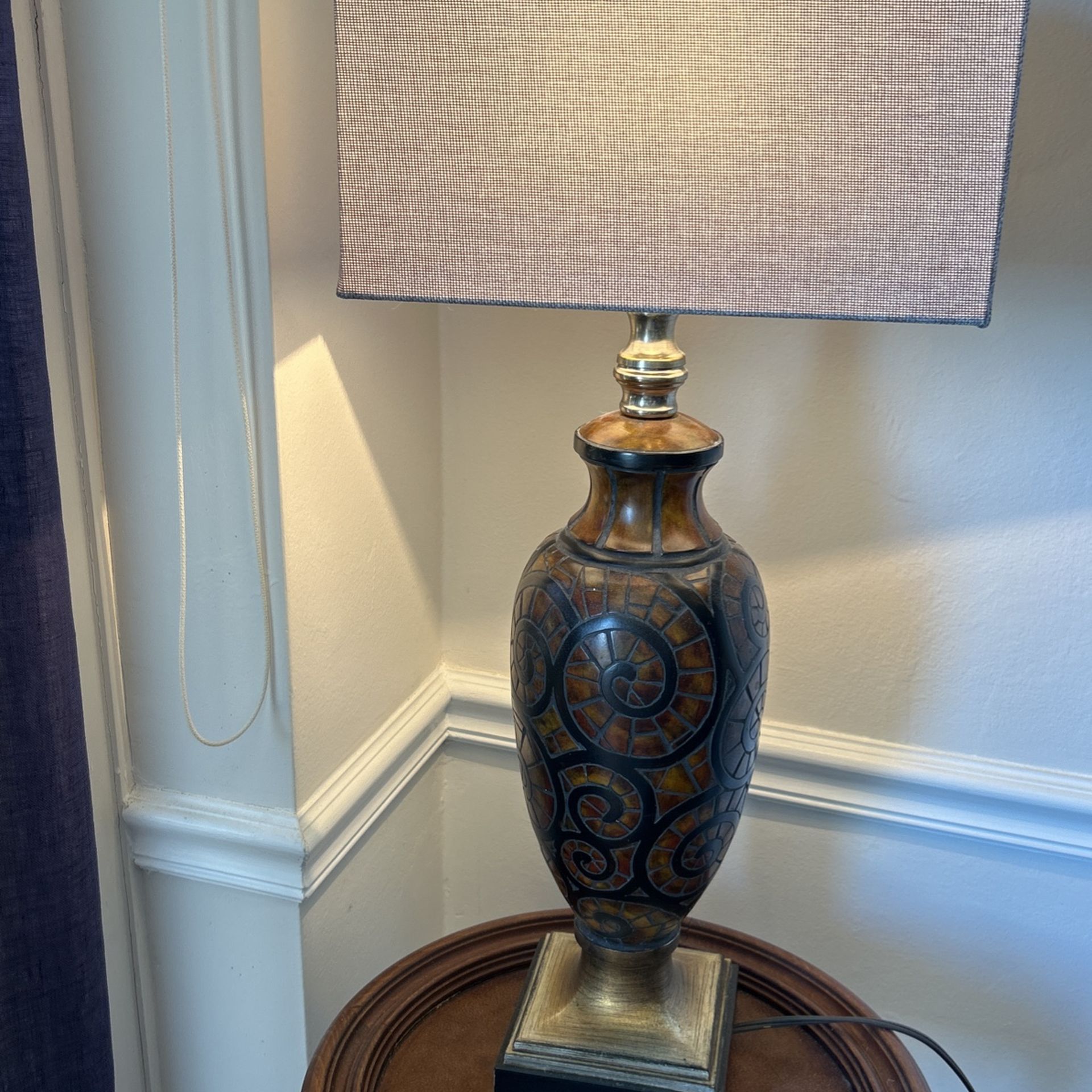 Somerson Designs from the Rhode Island School of Design. Faux Tortoise shell swirl. The lamp height is nearly 28’. Another 3’ with the finial. The wood square base is 5.5’ by 5.5 ‘ Socket turn knob on/off. New shade included.