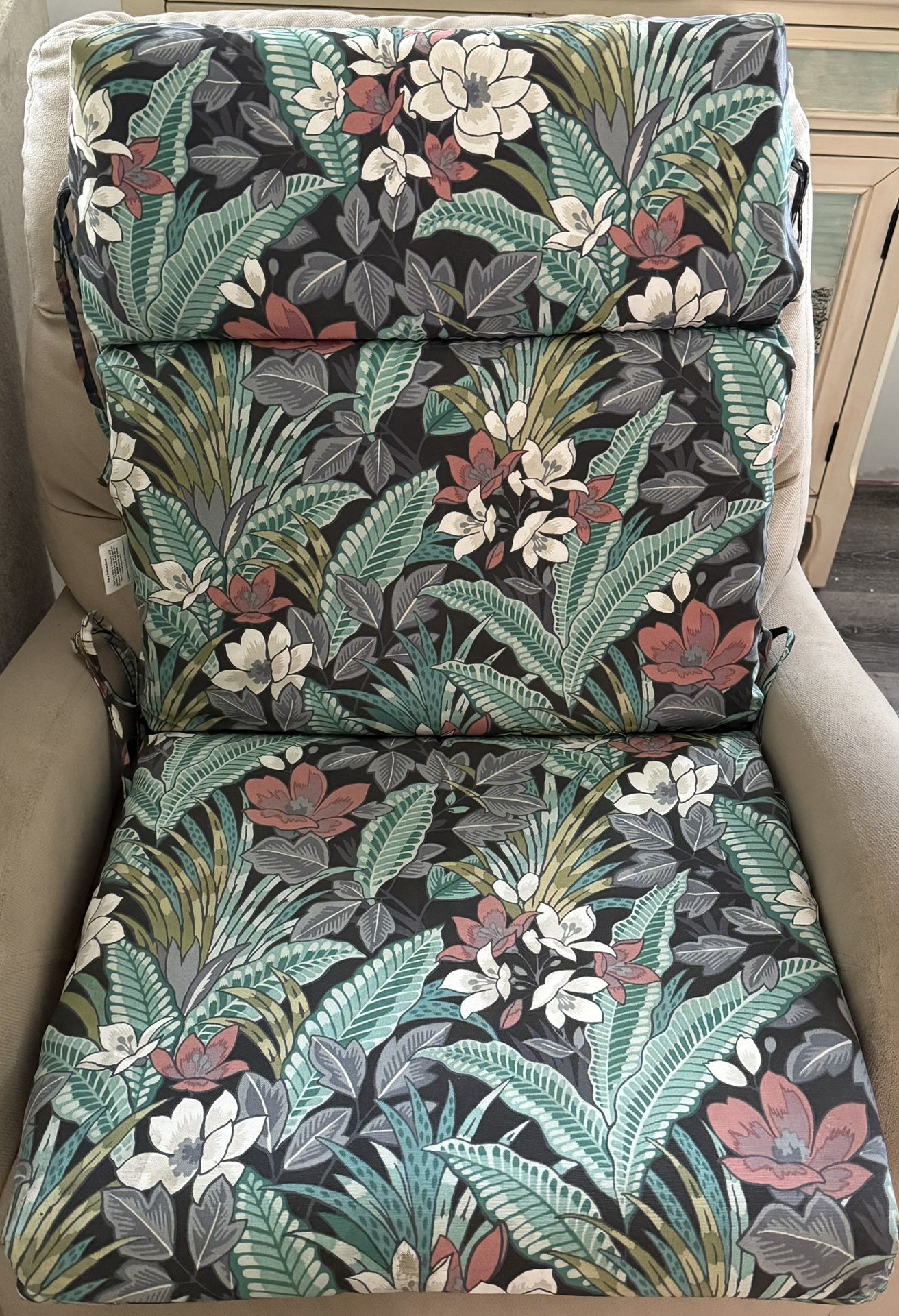 Hampton Bay Seat Cushions Set of 4 Tropical Theme Length of Seat 20" Length of Seat Back 24" Width 21" In Excellent Condition The chairs I have are too small for the cushions so I took the picture on a recliner $40 for all 4