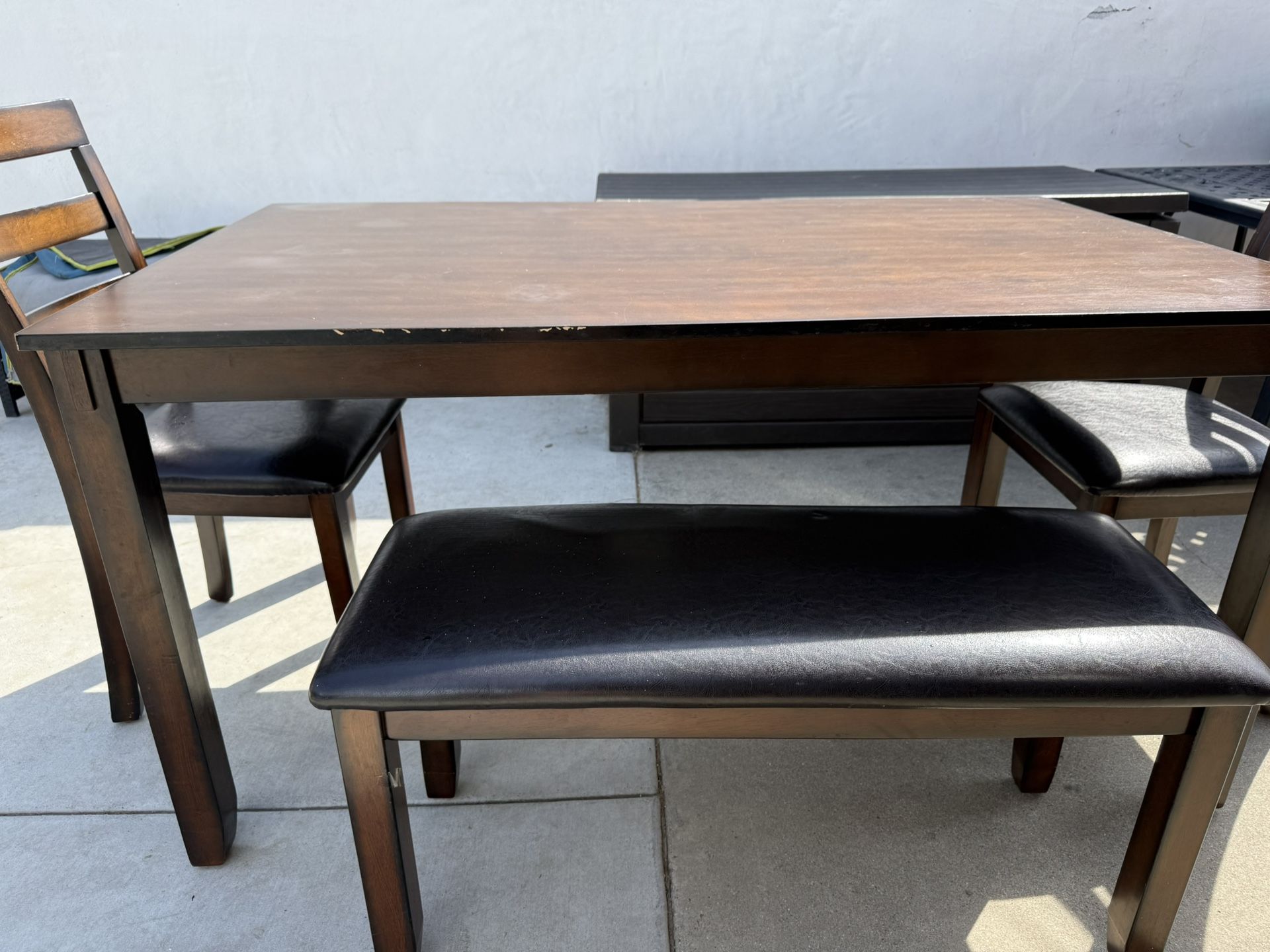 4ft length 2.5ft tall 3ft width 6 person table, 4 chairs, 1 bench. Minor scratches from wear and tear.