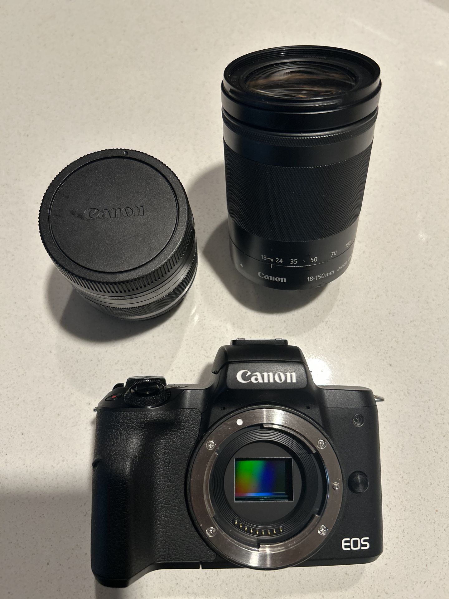 Selling my Canon EOS M50 Mark II Mirrorless Digital Camera. It currently does not power on. It shut off during recording and has not turned back on since. I’ve tested with a new battery but have not had time to further diagnose the issue. Selling strictly **AS-IS**. I’ve upgraded. What’s included: Canon EOS M50 Mark II camera body – Does NOT power on – Battery door closes but is missing the small spring/hinge piece, so it can detach Canon EF-M 15-45mm IS STM Kit Lens – Fully functional, no issues. Canon EF 50mm f/1.8 STM Lens (for parts) – Glass is fine – Mount grooves damaged from a fall (plastic mount scratched), will not properly attach Great for: • Repair technicians • Parts harvesting • Someone looking to fix and flip **Selling AS-IS. No returns.** Message me with offers. Parts can be sold separately as well.