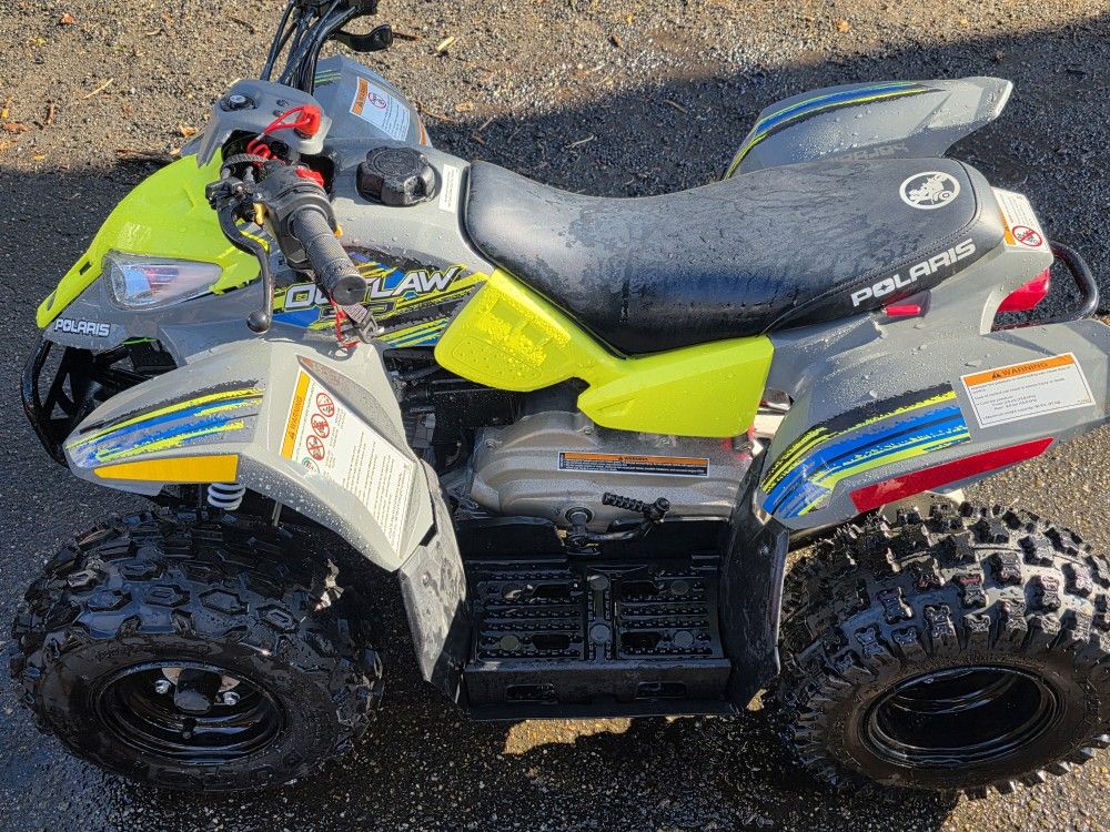 Clean 2017 Polaris Outlaw 50, ATV is a one owner and bought from Pete Cycle new off the show room floor in 2017 was only rode a handful of times. Tires still have the rubber nipples on them from factory CLEAN TITLE owners manual and factory tool kit under the seat 2 Factory keys for it factory foot peg risers still on for shorter kids. Has a brandnew battery. Starts up runs great I would replace the gas it has been sitting for a bit otherwise very clean and hard to find in this good of shape and all original