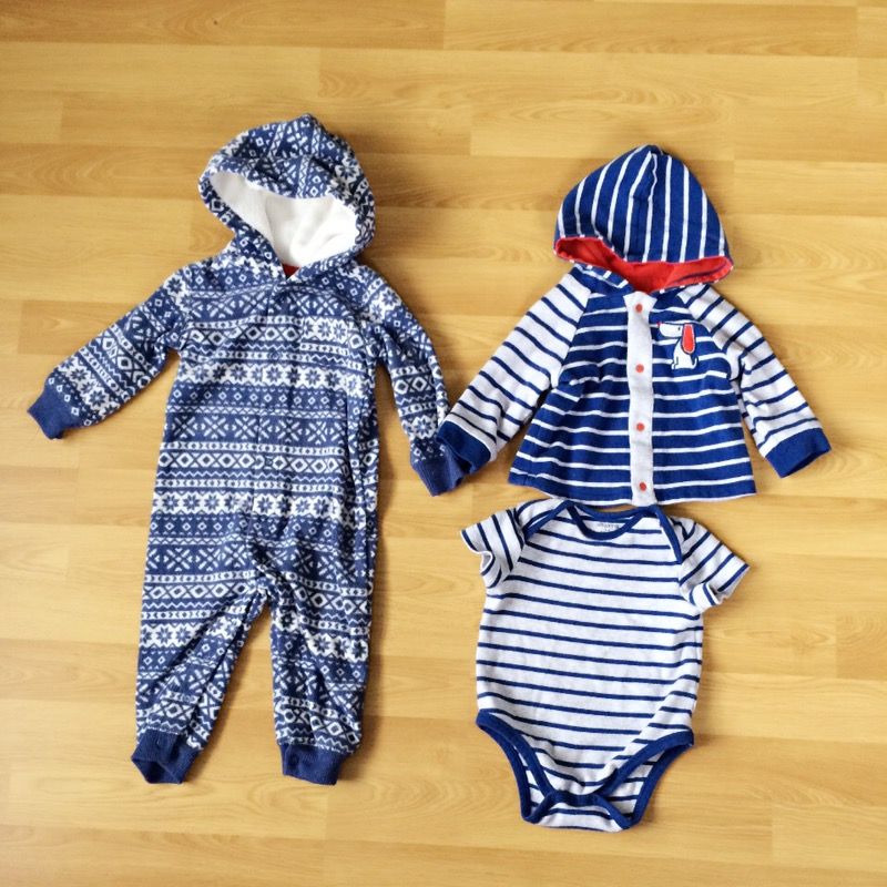Left: carter's fleece onesie $5 Right: off spring 2 pieces $5 $9 for all.
