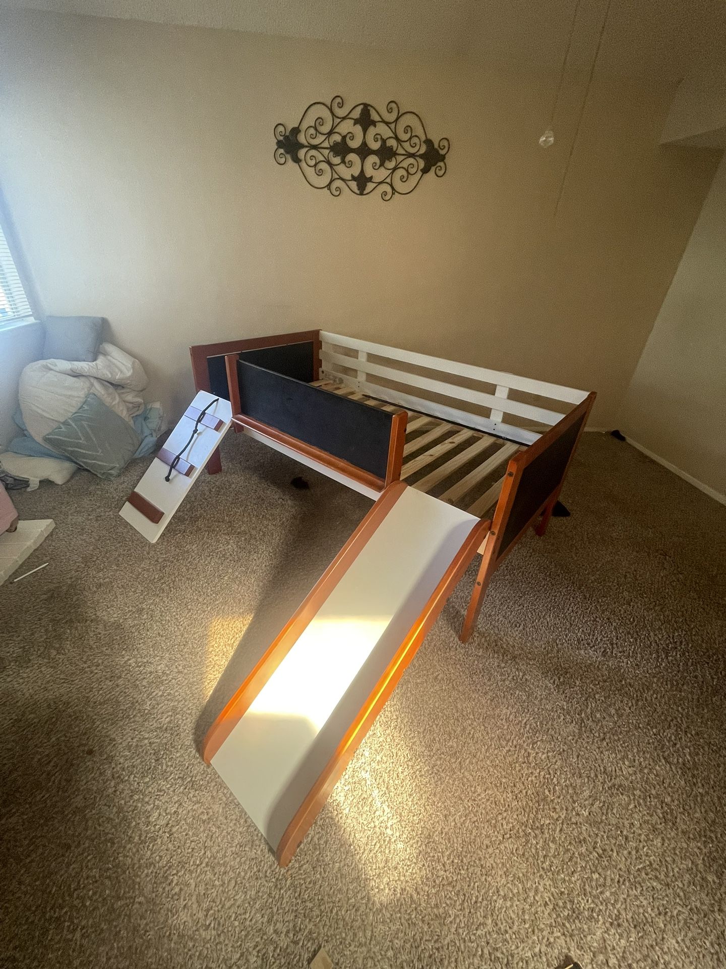 Kids twin bed frame. This is about 2 months old, our daughter never used it. It’s in new condition. Has slide and ladder for access. Also has shock-board for drawing.