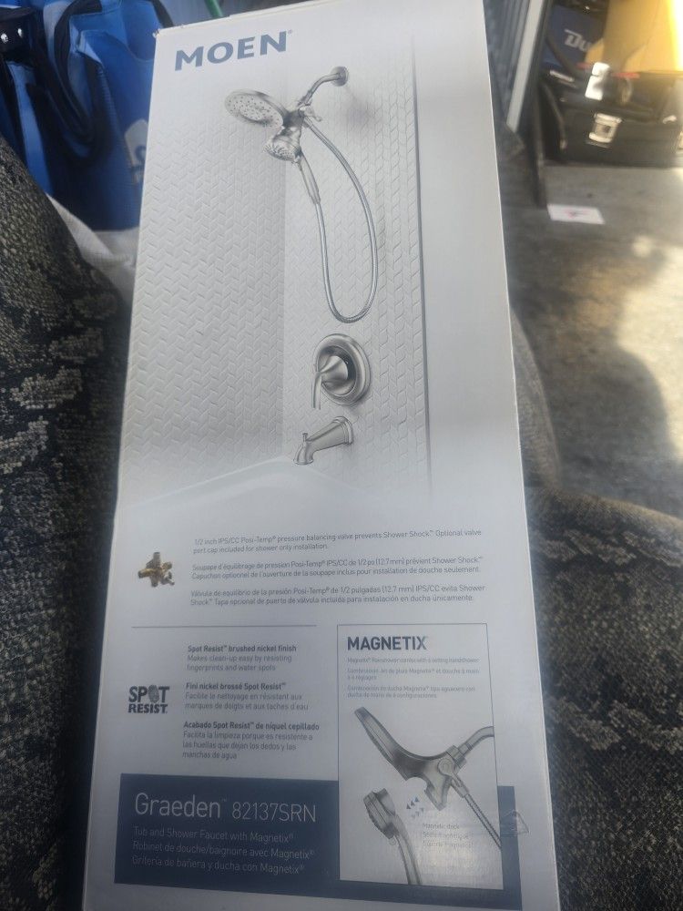 Brand new in box never opened retails for $220 only asking $100 pick up Craig and rainbow The Graeden™ Tub and Shower Faucet offers an effortless showering experience, featuring magnetic docking, smooth lines, and a sleek, transitional design. It’s equipped with six shower settings and three showering configurations -- use the showerheads separately or together for maximum coverage. The showerhead also features Moen’s Magnetix® magnetic docking technology, so it’s easy to release and return the handshower – even with your eyes closed. Graeden is available in Moen's exclusive Spot Resist Brushed Nickel finish, which resists fingerprints and water spots to maintain the fixtures brilliance and minimize cleaning time.