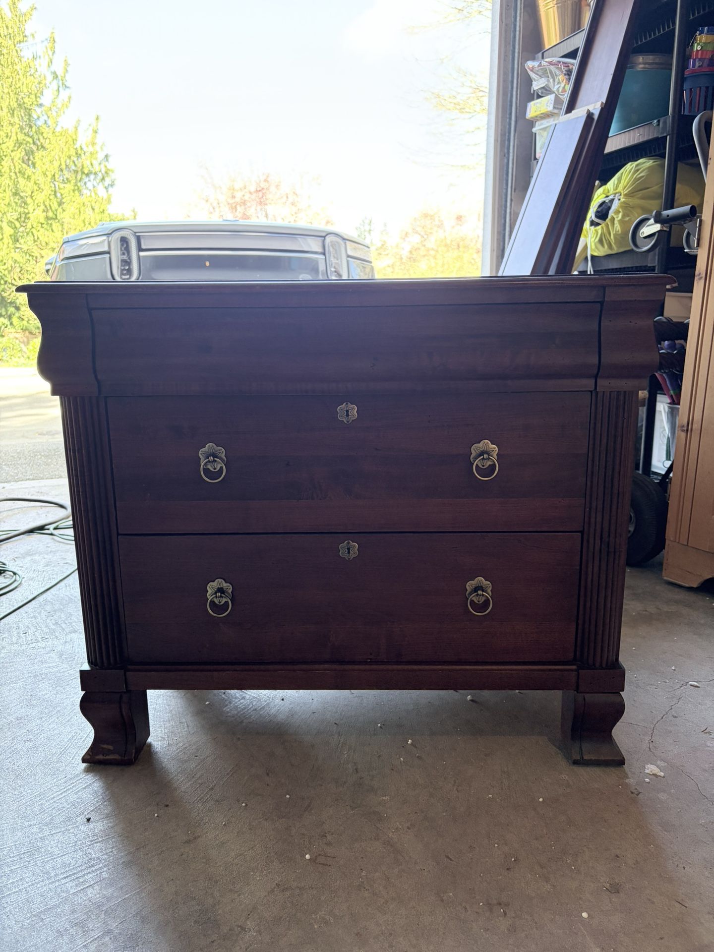 Solid wood cabinet with three drawers. Top has damage from water as shown in pic #3. Very functional bedroom furniture.