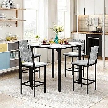 New in box, pick up in Pomona. ColorMarble Texture & Velvet Chairs Item Weight82.2 Pounds StyleModern, Contemporary Assembly RequiredYes Shape1 【 Comfortable Chair 】 : AWQM 5-Piece dining table set, with 4 velvet bar stools. The padded seats are filled with high-density foam and paired with ergonomically designed curved backrests that perfectly conform to the body's natural contours, offering exceptional comfort. Whether working, dining, or relaxing for extended periods, they effectively reduce back pressure and fatigue, ensuring a more comfortable experience. 【 Space Saving 】 : The counter height table optimized for small spaces, the chairs can be fully tucked under the table, saving significant floor space and making them ideal for compact apartments, kitchens, or living rooms. The compact size and smart structural design maintain functionality while keeping the area tidy and visually appealing, making it a perfect choice for small-space homes. 【 Suitable for Various Scenarios 】 : This 5-piece dining table set is not only suitable for daily meals but also functions as a desk, computer table, workstation, or leisure area, meeting the needs of various living scenarios. Whether for family gatherings, afternoon tea, or work and study, it effortlessly adapts to different roles, offering a versatile and flexible experience. 【 Strong and Durable 】 :The table surface is made of FSC-certified wood.Constructed with high-quality MDF tabletops and thickened metal frames, the dining table set for 4 is sturdy and durable, capable of supporting a total weight of up to 250 lbs. The reinforced table and chair legs ensure stability without wobbling or tilting during use, providing a safe and reliable experience for long-term family use. 【 The Convenient Cleaning Maintenance 】 : The 5-piece dining table set are coated with waterproof, stain-resistant PVC, effectively repelling stains and grease. Daily cleaning is as simple as wiping with a damp cloth, saving time and effort. Additionally, the smooth rounded edges prevent accidental bumps, ensuring family safety and extending the furniture's lifespan.