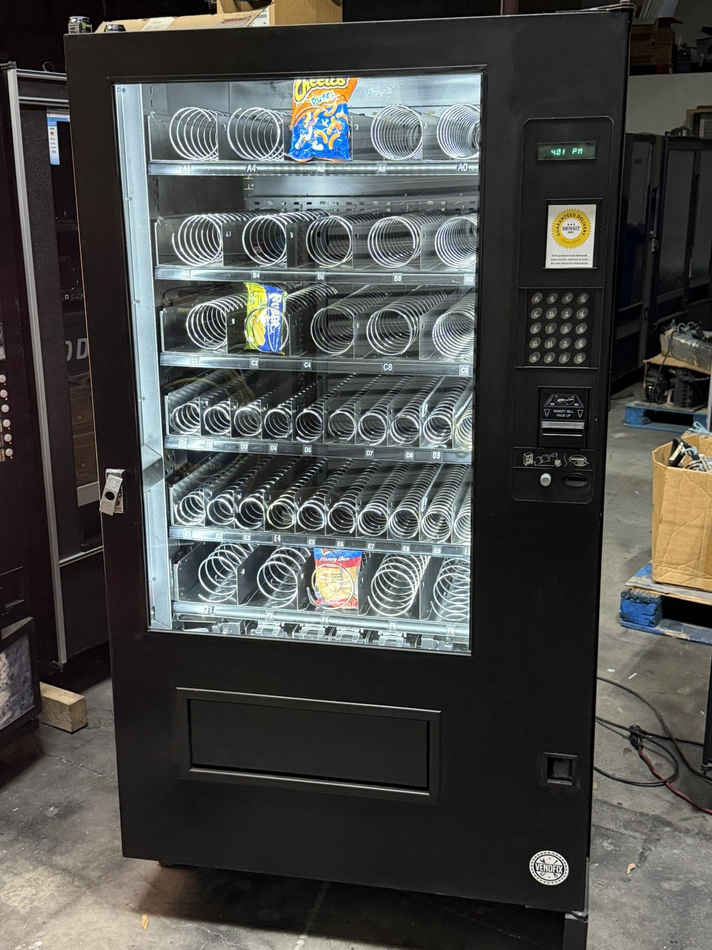 Location ready snack machine (not refrigerated) All tested and working. Will operate with a credit card reader not included Led lights Drop sensor guarantees product delivery or money back. Comes with lock and two keys Priced to sell $950 firm on price google these machines to see their value.