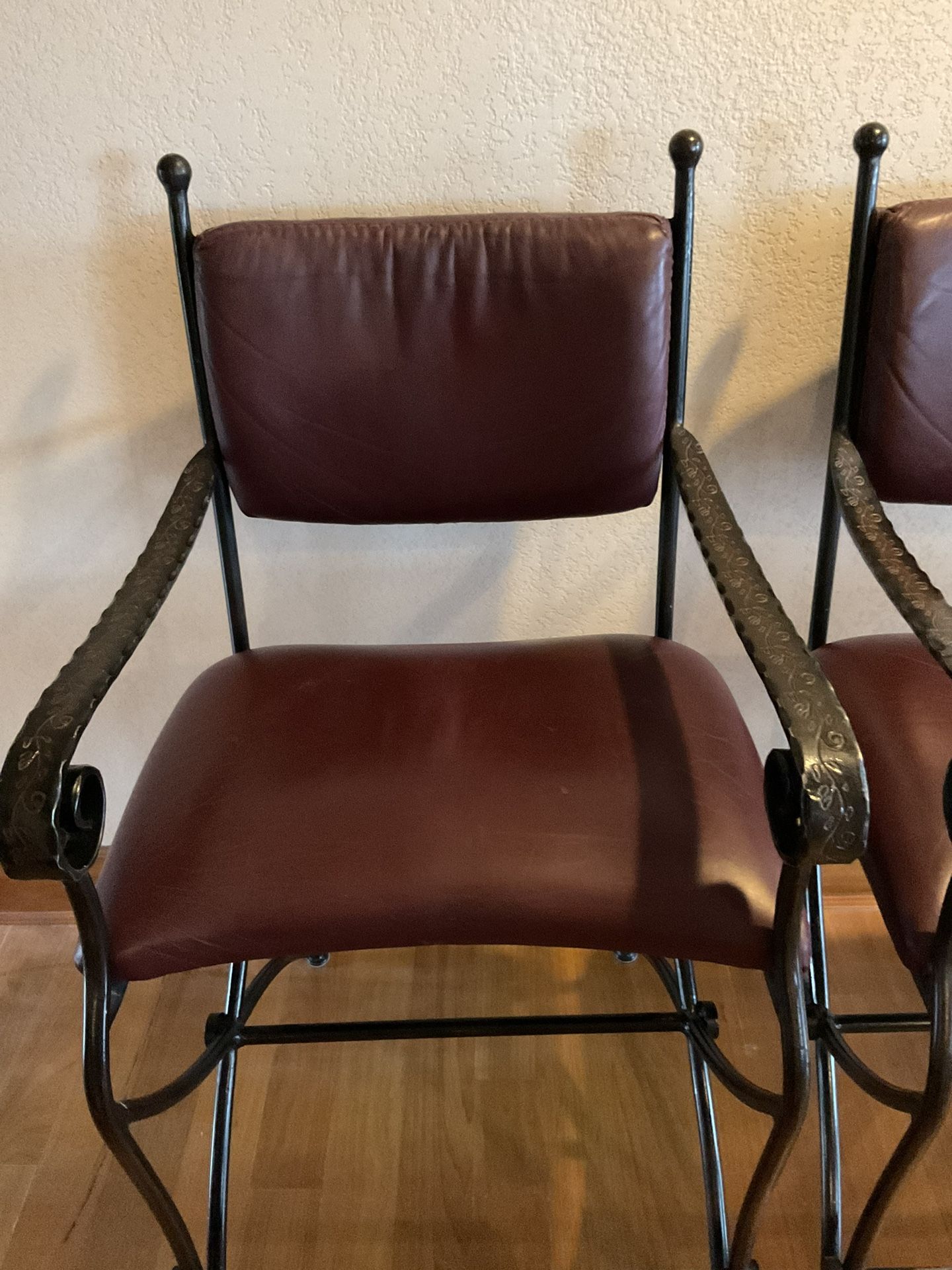 4 wrought iron barstools with burgundy leather seats and backs Very well made, cost $500 each new; selling for $200 each Only wear is paint on lower bar from shoes, an easy fix