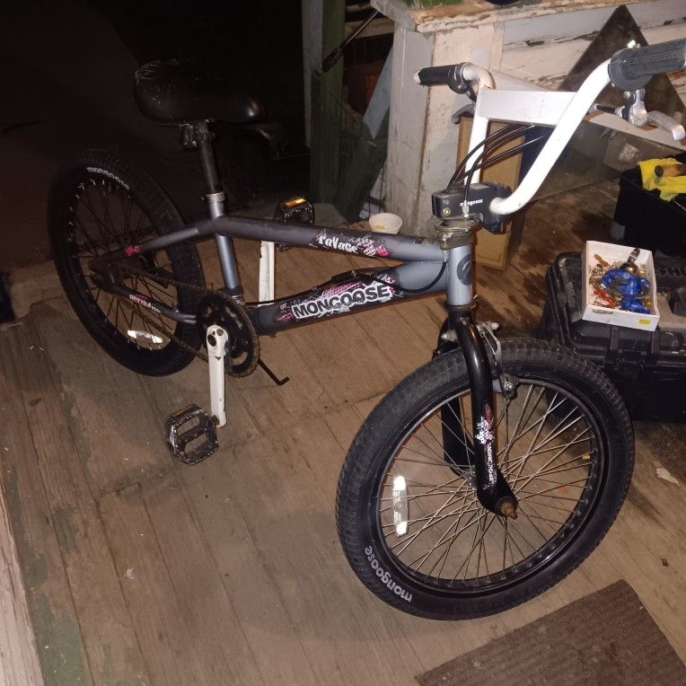 20-inch grey Mongoose Ravage BMX bike