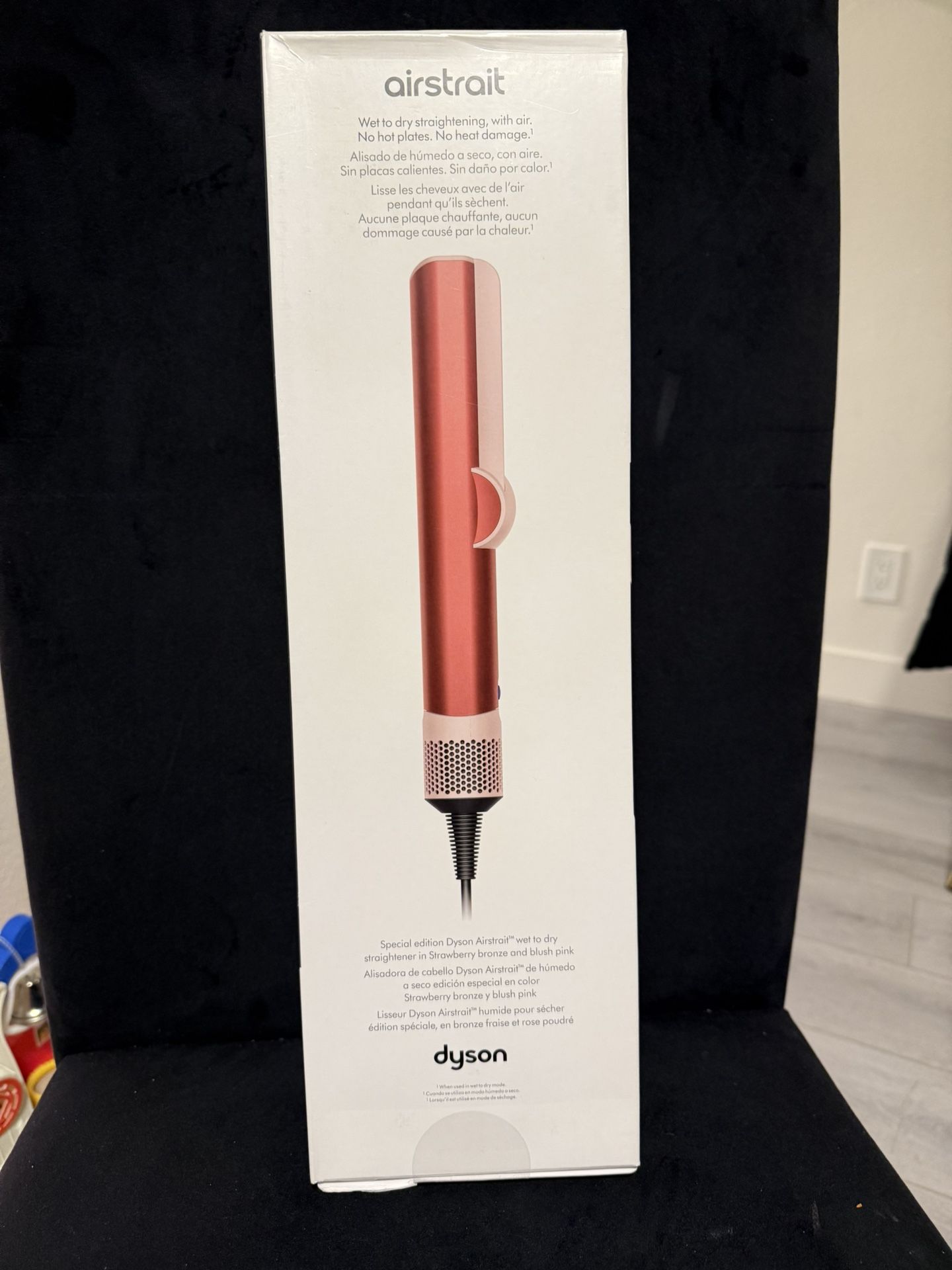 Brand new Special edition Dyson Airstrait in Strawberry bronze and blush pink with complimentary Presentation case. Dries and straightens simultaneously from wet to dry. Engineered to create a natural straight finish for multiple hair types. No hot plates. No heat damage. Your routine, simplified. When used in wet to dry mode. Features Straighten and dry hair - at the same time. Three pre-set temperatures - 175°F, 230°F, and 285°F - take your hair from wet to a finished style with one machine. Touch up or refresh your style from dry. Style at 250°F or 285°F or use the optional Boost mode for maximum styling impact. Your machine senses when hair is between the arms and automatically drops to low airflow when it's not - for quieter, more efficient styling. Included : Non-slip heat mat, Black and Blush presentation case.