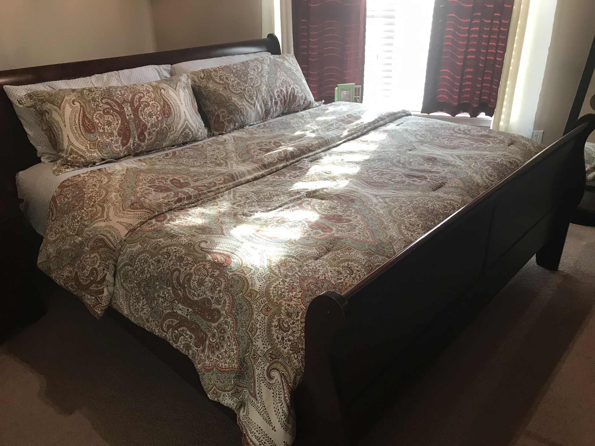California King with mattress box spring…mattress covers regularly washed and kept in protectors….dresser, and night stand. All in good condition. Clean pet-&-smoke-free home. I plan to downsize, so you can even have all of the comforter sets I have if interested.