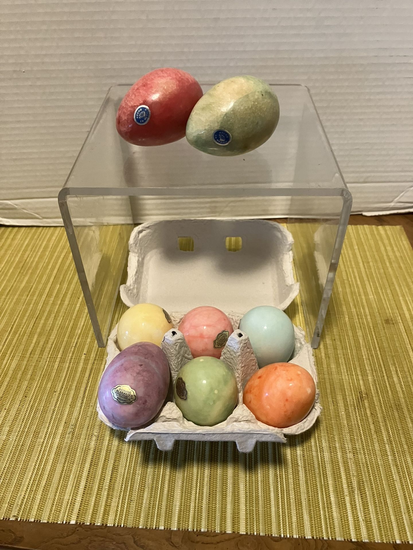 This gorgeous set includes the 6 pastel Italian alabaster eggs with the carton. I also have the 2 lovely marble/alabaster made in Mexico. Perfect as Easter decor. Pick up at EITHER 10803 Bandera Rd or 10683 Huebner Rd.