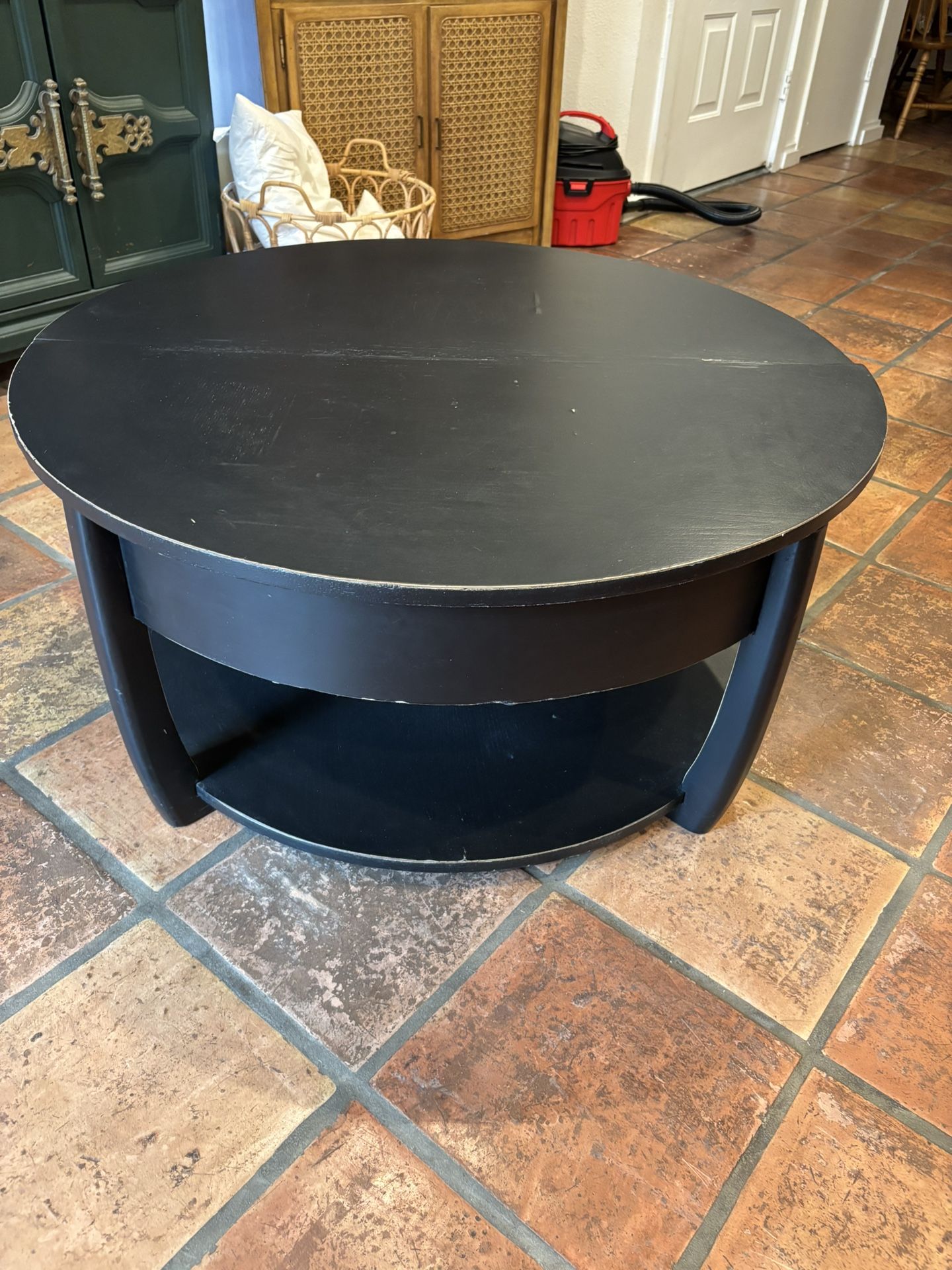 Coffee table was professionally painted black and sealed with clear coat by antique furniture shop. (Say Yes to the Dresser). Good condition and it is a quality, real wood piece of furniture. 38.5” wide 17.5” tall