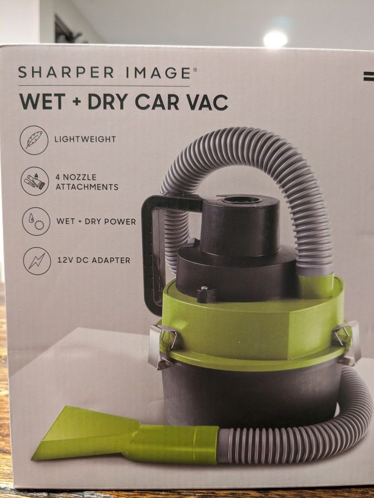 Lightweight, wet and dry, 12V DC adapter. It's missing one nozzle attachment (the one to blow up an air mattress ) and I never figured out how to attach the brush portion to the brush end of the nozzle. Like new. Never used.