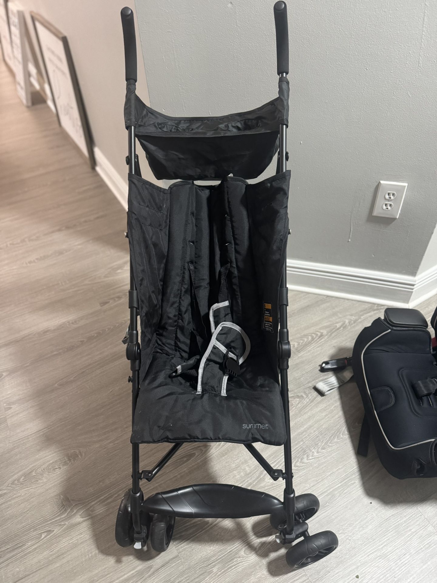 Lightweight, compact umbrella stroller with 5-point harness and storage basket. Folds easily and perfect for travel or quick errands. Fabric in good used condition. All wheels/straps work as they should.