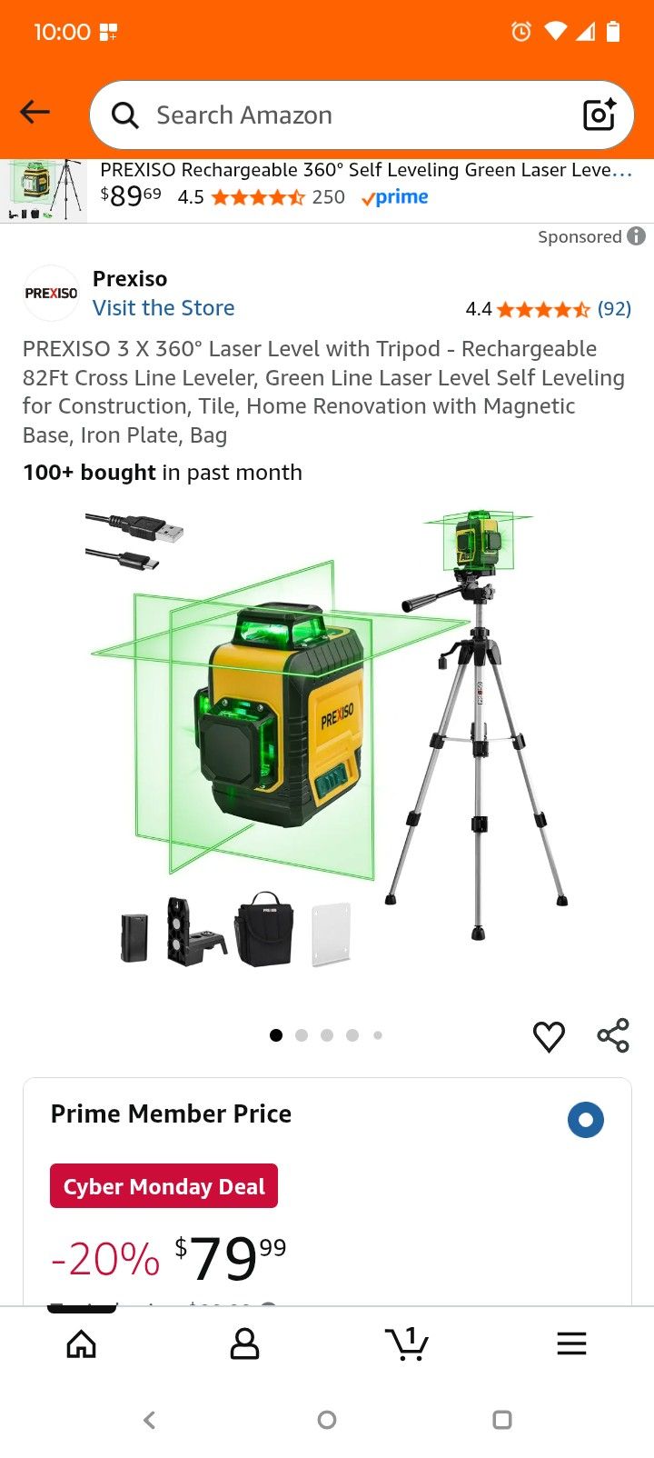 Prexiso 3 x 360" laser level with tripod- rechargeable 82ft cross line leveler, green line laser level self leveling for construction