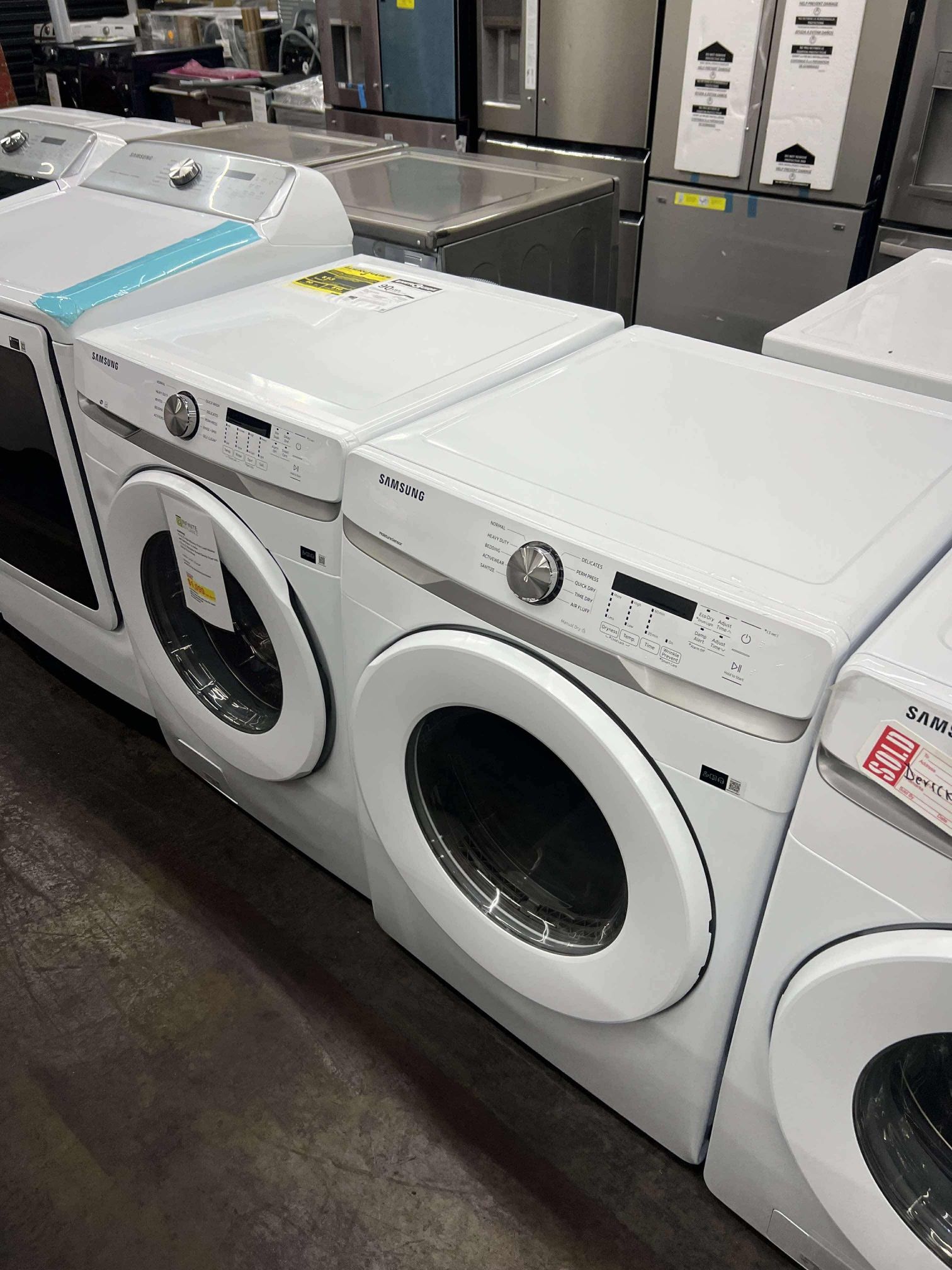 SAMSUNG 4.5 cu. ft. High-Efficiency Front Load Washer with Self-Clean+ in White 7.5 cu. ft. Stackable Vented Electric Dryer with Sensor Dry in White Dimensions:H 38.75 in , W 27 in, D 31.34 in OPEN BOX Model:# WF456000AW/DVE456000W Delivery available 1 year warranty Come visit us! Open 7 days Hablamos espanol Reg price $1,798 Sale price $1,099 FOR BOTH Take it home today only $39 down No cred1t needed