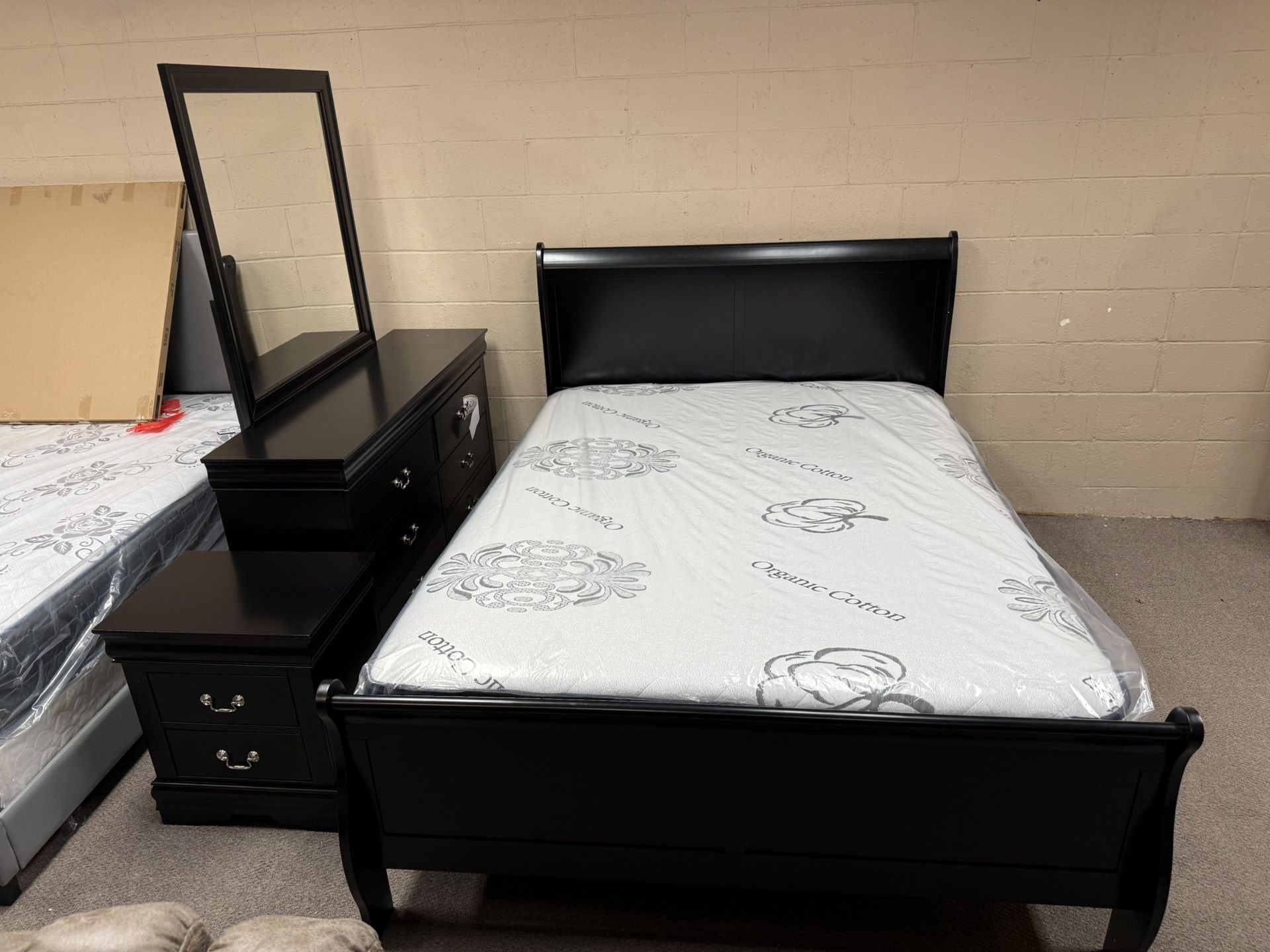 4 PIECE QUEEN BEDROOM SET! BED, MATTRESS, NIGHTSTAND, DRESSER, MIRROR