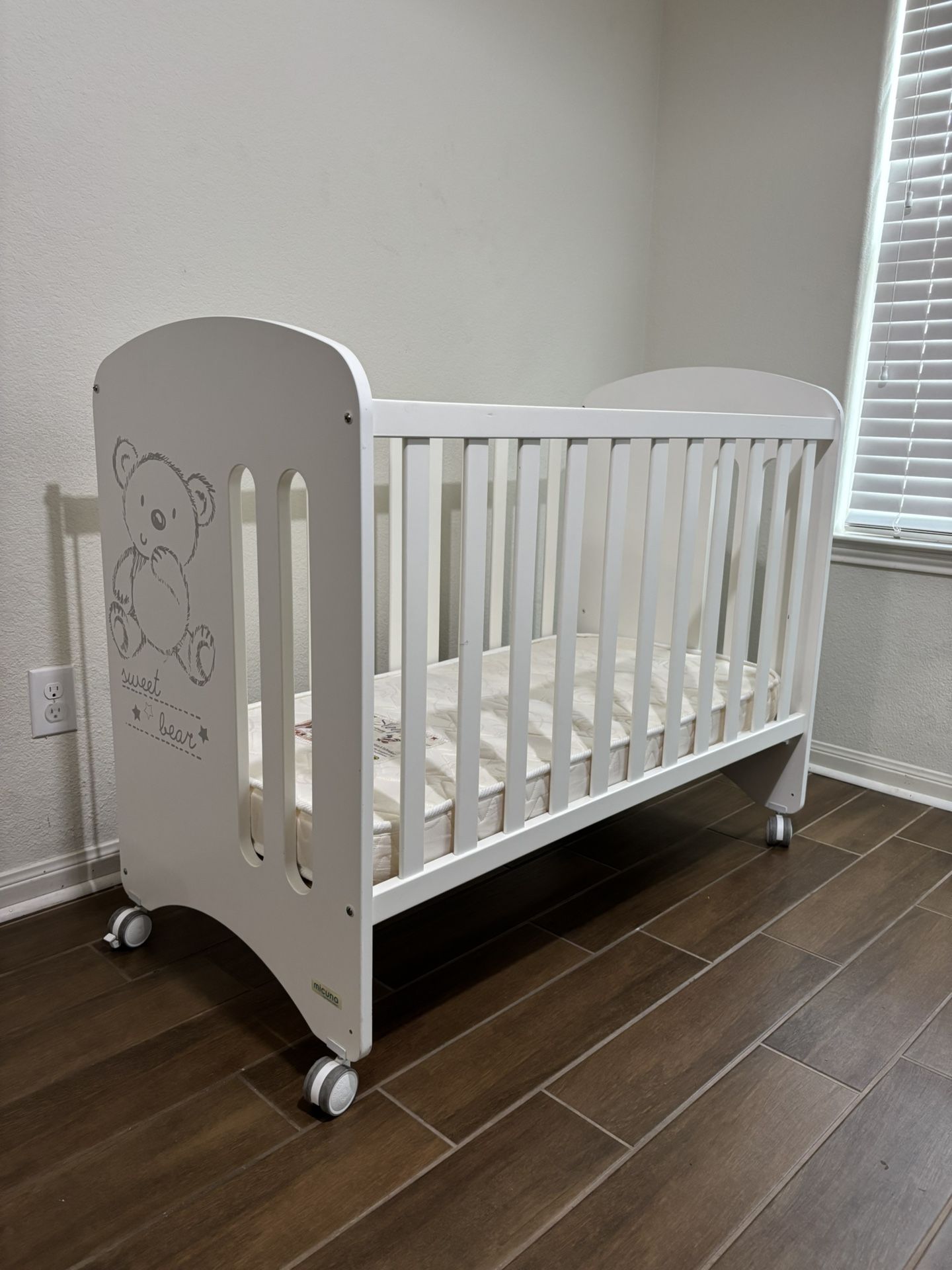 Normal use. Good condition baby crib. Our son hardly slept in it.