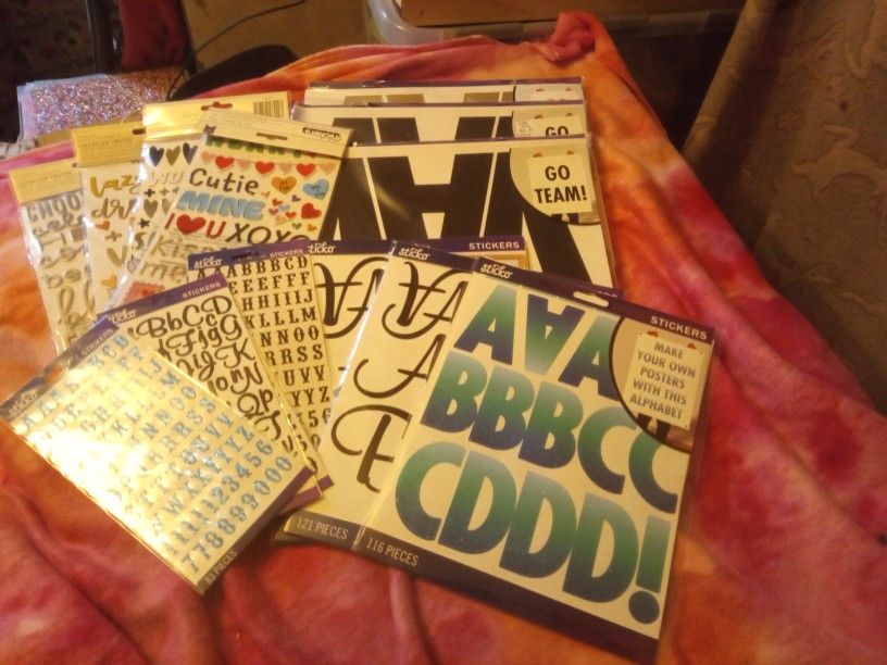 3 large poster size letter 2 black 1 silver .76 in each pack 3 smaller packs 2 black 121 pieces 1 cool glitter 116 pieces 4 misc letters and 4 front and back stickers
