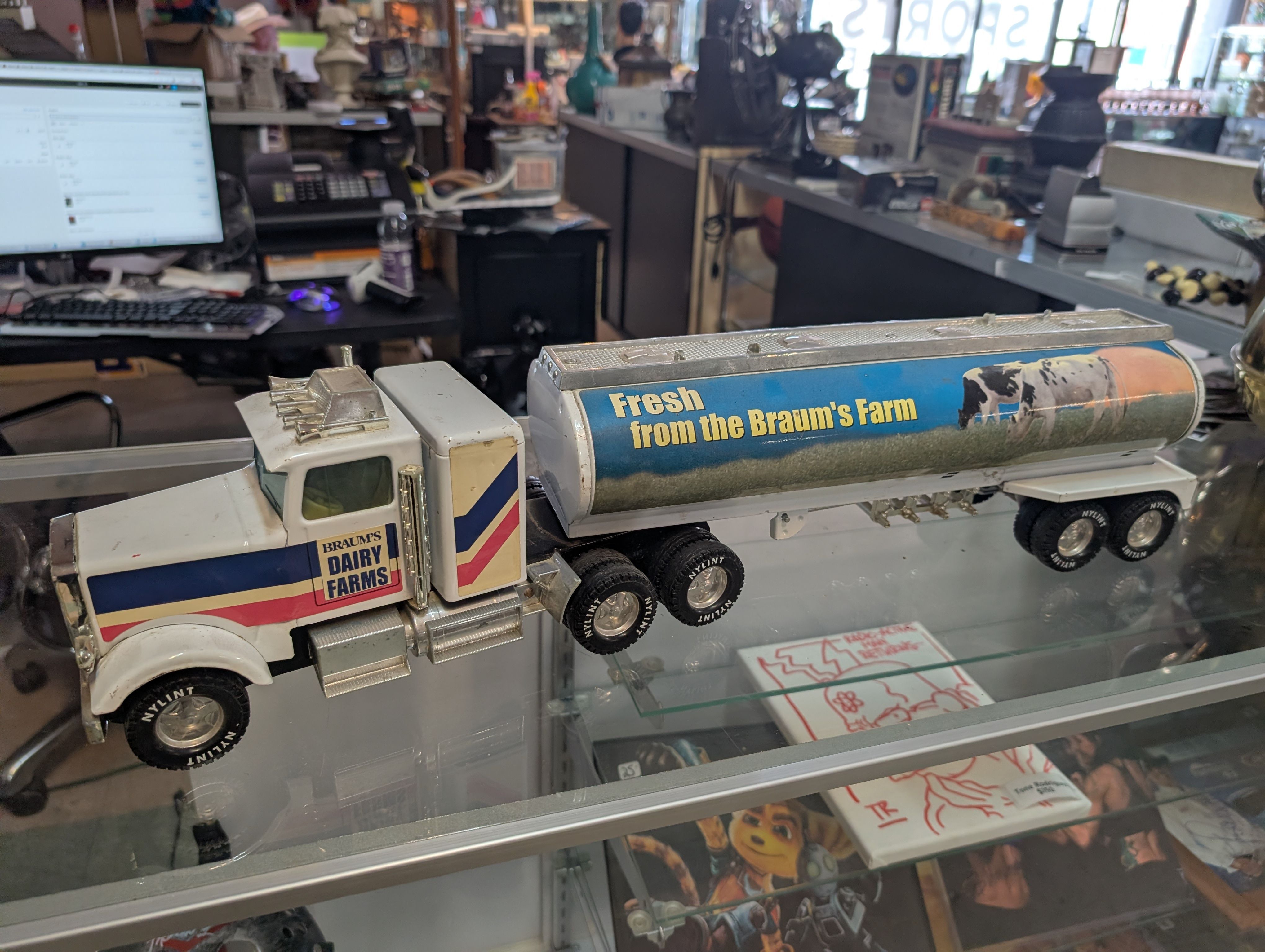 Vintage Nylint Braums Dairy Farms tanker truck 18 wheeler pressed steel Freightliner with Fresh From The Braums Farm graphics and detailed dairy branding. Classic American advertising semi with durable metal construction. - I'm Located in Stockton I'm Also willing to trade / barter for any of the following: Cellphones Video Game Lots (Nintendo, Super Nintendo, N64, Sega) LEGO Pokemon Items Sports Cards Tools Computers Jewelry (Rings, or Necklaces) Disney Collectibles Vinyl Records Toys (Collectibles, 90s, Games, Vintage) Sports Collectibles Silver Tablets Shelves / Shelving Antiques Arcade / Skill Games Wall Art Chainsaws Landscaping Tools Mancave Items Retail Displays Autograph Items Sculptures / Statues Cast Iron Decor Pottery Yard Art Magazine Lots (LIFE, Sports Illustrated) Historical Items _________