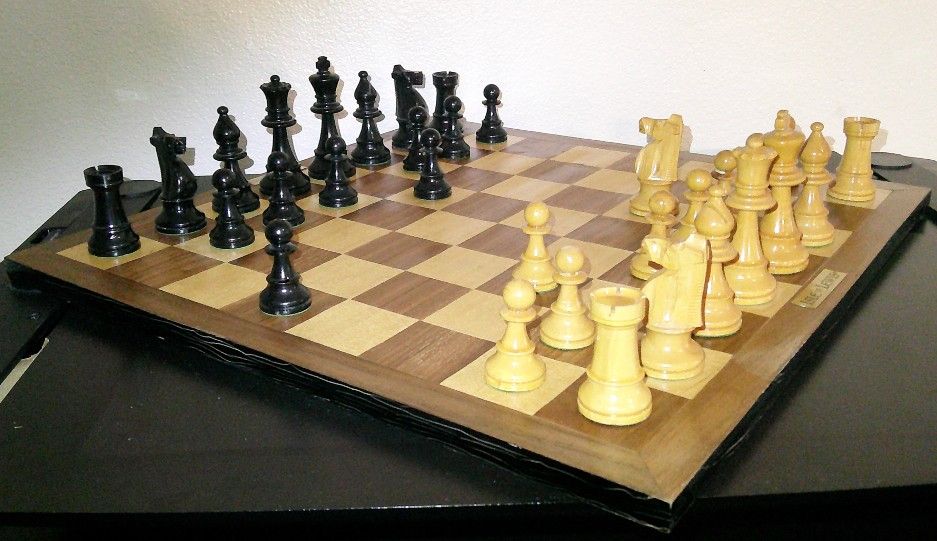 Length: 20" Width: 20" Depth: 1/2" Condition: Excellent. There are 2 metal plates with "ISLE OF LEWIS" written on them. Chess-Board and Pieces are made of wood. And this chess set is made to last.. The colors: Brown and light brown.