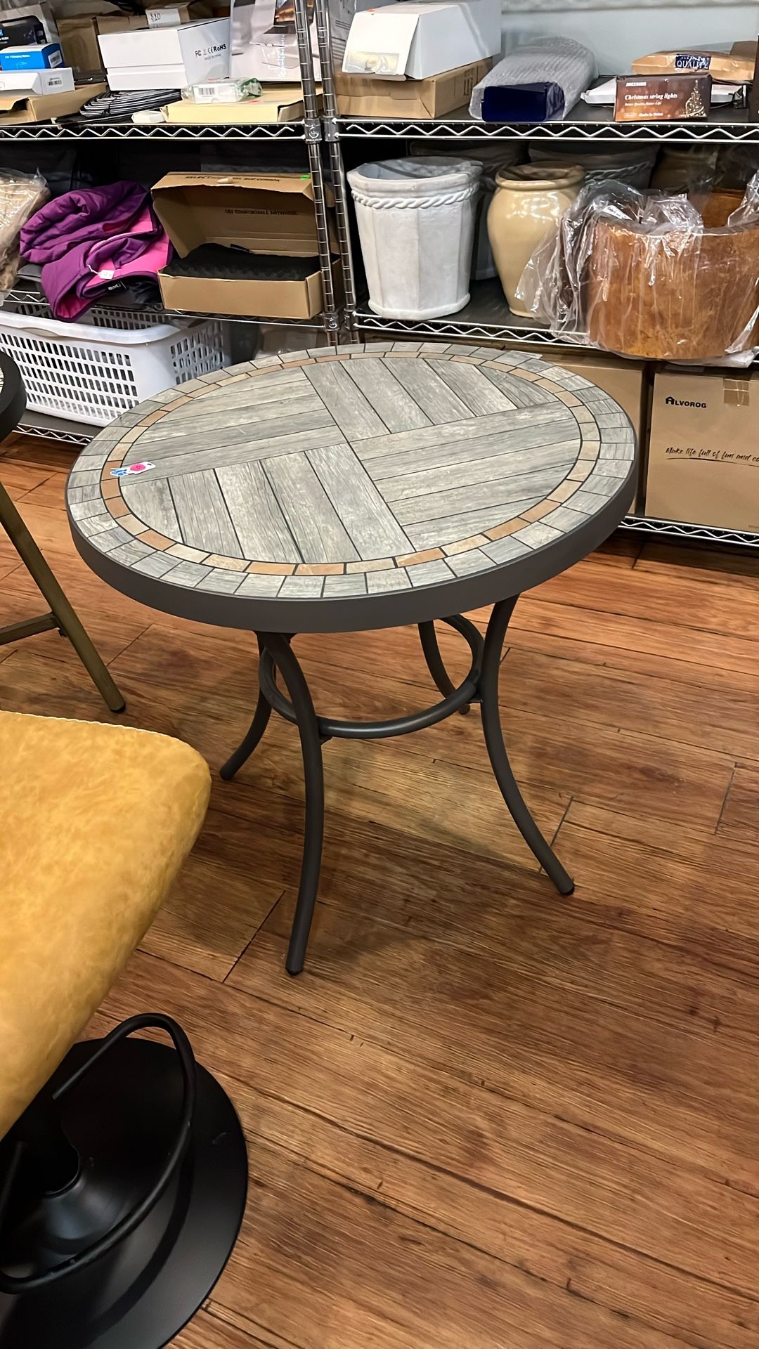 Brown 27” side table wood look tile pattern 27” high x 27” round Located at Treasures Depot 9207 Broadway Ave Brookfield Illinois