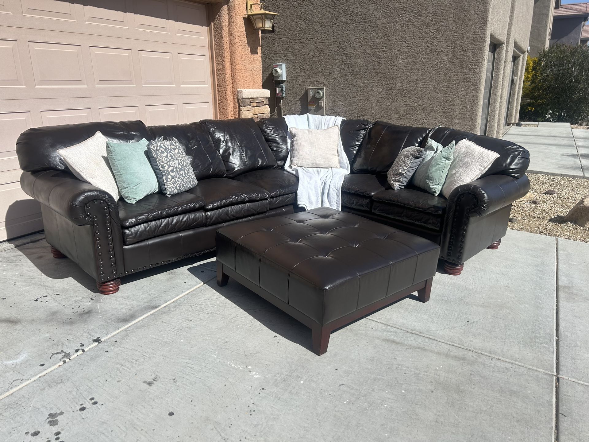 This is a two piece sectional with ottoman. Real leather. No rips. No pets. Non-smoking home. All cushions can be removed. Has been cleaned and conditioned. Very comfortable. med feel to the cushions. Deep brown in color. Willing to deliver Note decor blanket and pillows not included. Measurements: Ottoman 40inx40in 117in x 93.5in Depth of seat 29 in