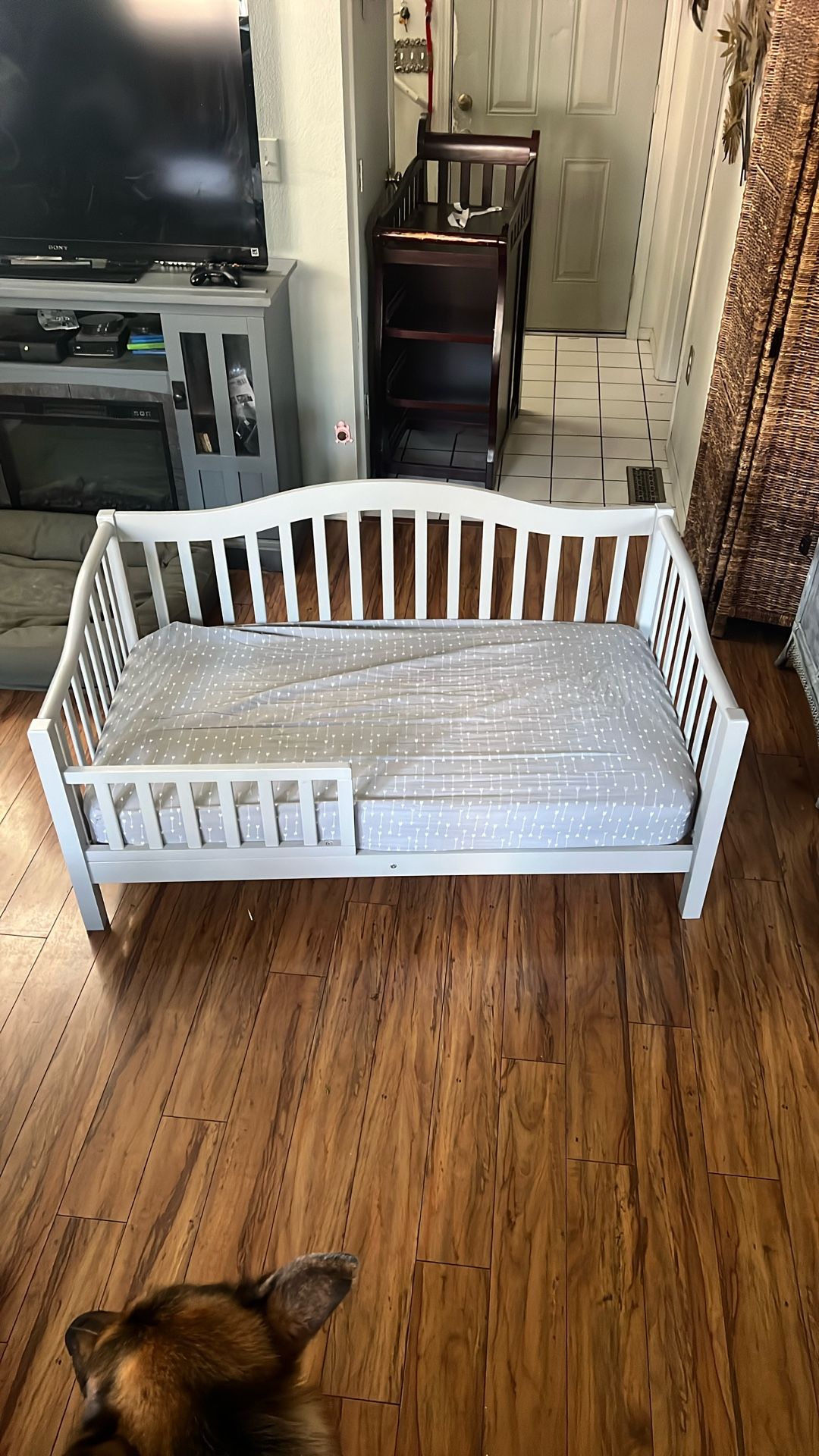 great condition has a few scuffs on the inner part of the paint but can easily be refurbished. comes with mattress that has barely been used. no stains or holes