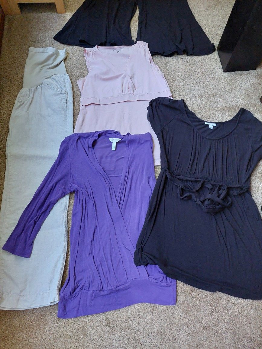 All for $10 Size Small/ medium Pants Gaucho pants- elastic waist isn't as stretchy Pink sleeveless top Black top Purple top