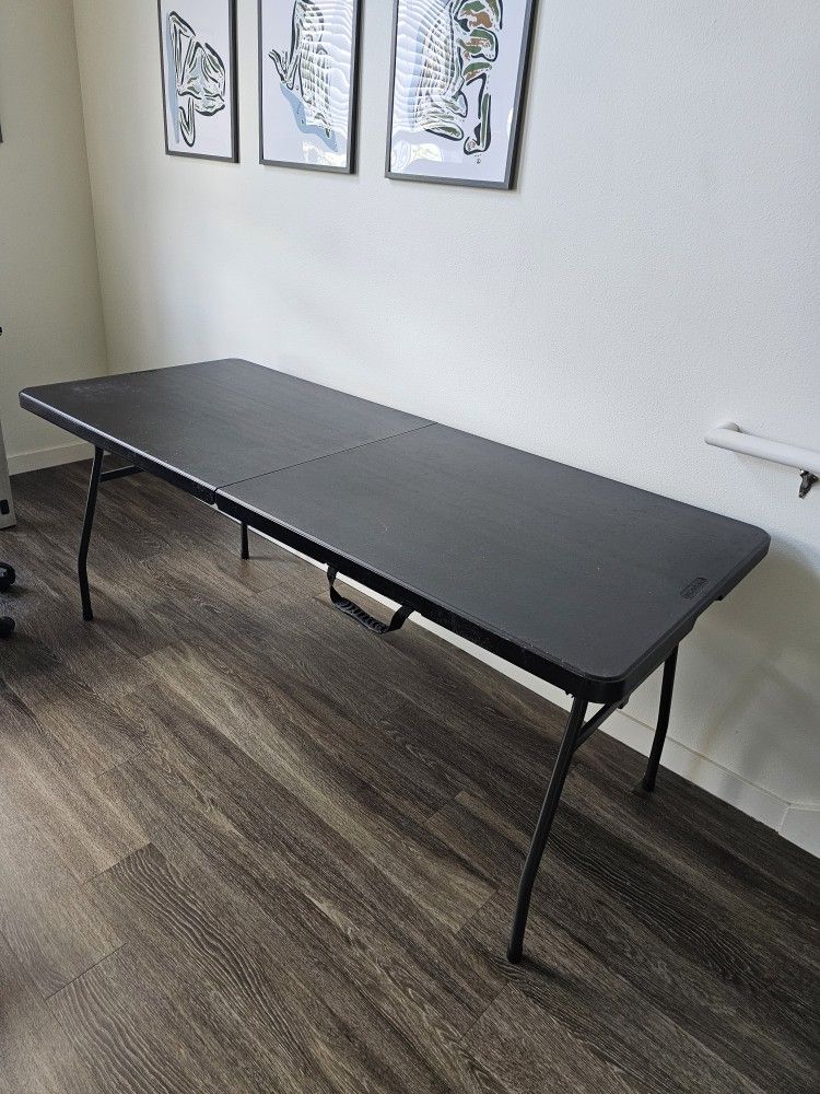 Black plastic folding table from Amazon Basics. Has a carrying handle for easy transport. 6 ft long For pickup in Bothell only. First come, first served.