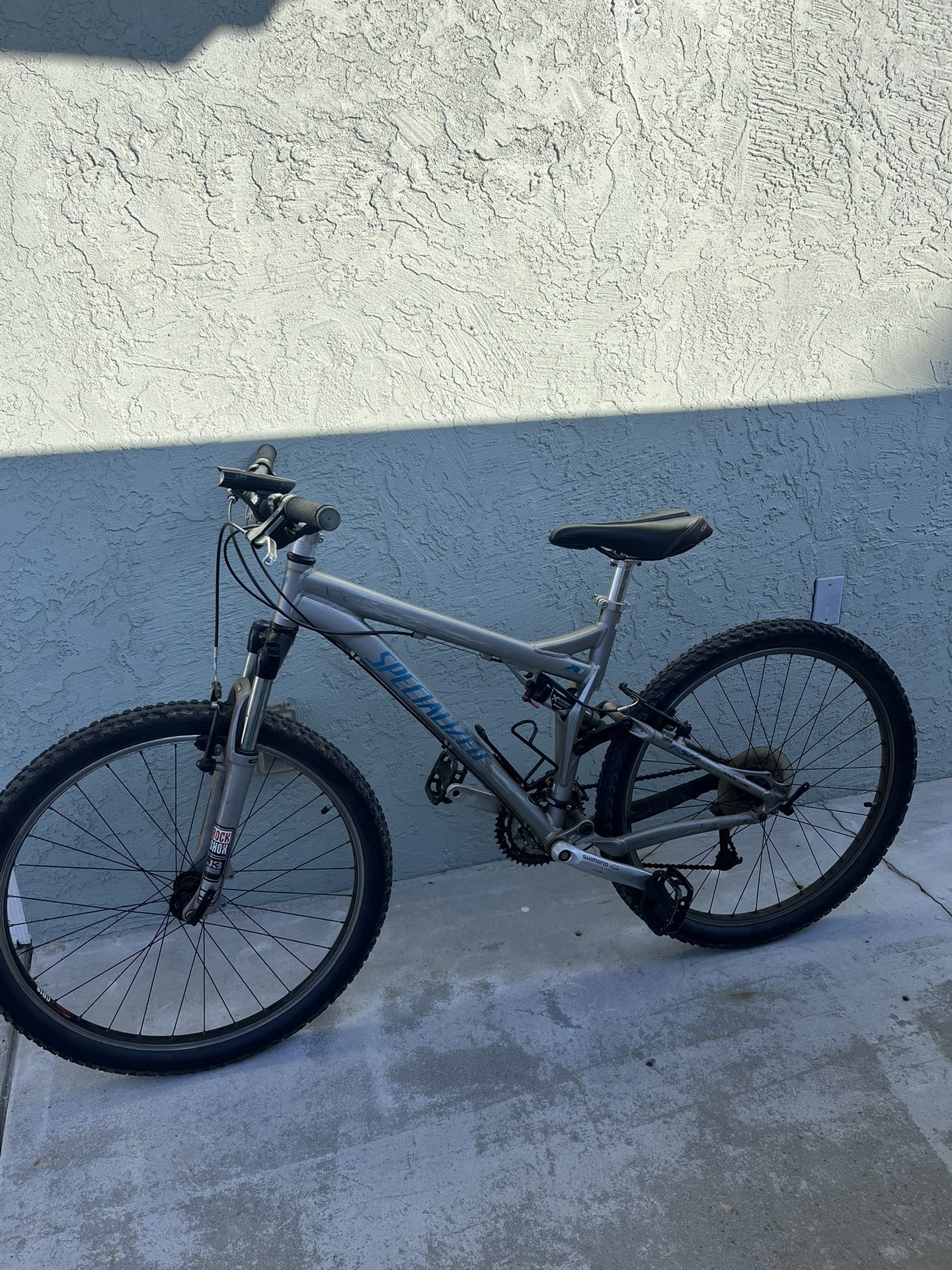 Full suspension mountain bike!!š²Specialized is the maker. I believe itās considered a large. I donāt know too much about it since Iāve only had it for a couple of months and have not ridden it too much. Iām also new to mountain biking so I didnāt know how to properly size a bike. Iām 6ā2ā and I thought large would be the right size for me but itās too small. It rides really well but my legs are too long š Itās a great bike for the person of the right size. I replaced the old inner tubes with brand new Specialized ādesertā tubes a few weeks ago. They are the super puncture resistant tubes, made for trails and roads with a bunch of thorns. Iāll throw in a brand new bicycle repair kit for free so it is a perfect Christmas present package!!! šš