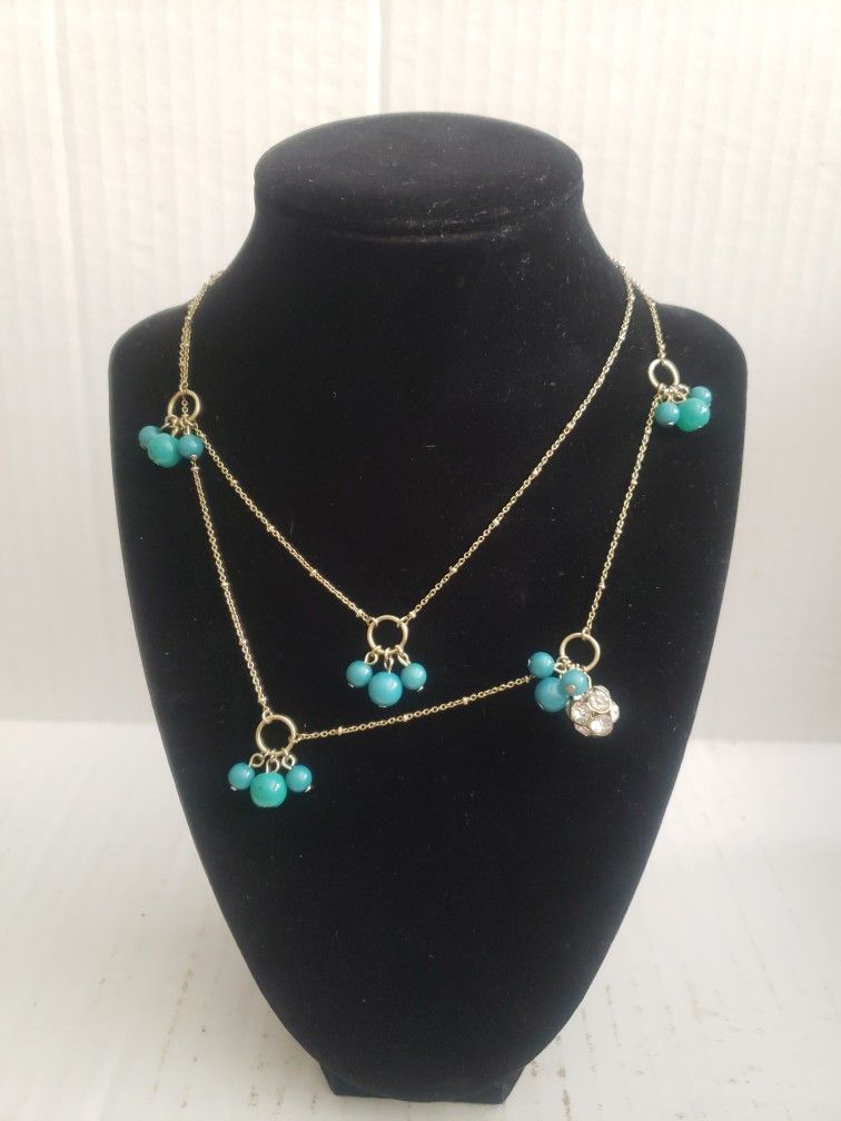 J Crew Vintage Turquoise Enamel Bead and Crystal Cluster Ball Necklace Goldtone 32" Long Preowned in Great Condition Please View Photos for Details CASH only Please!