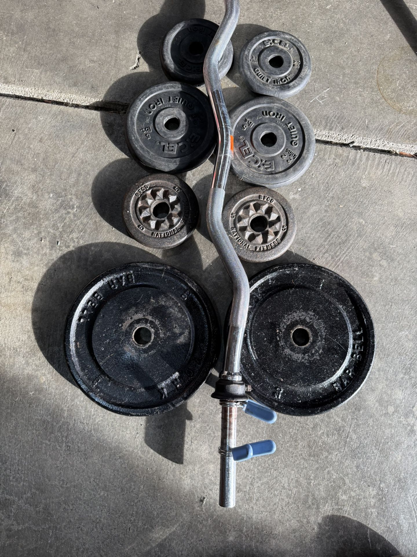 85. Total pounds solid steel bar more weights available. Excellent Dumbbells bench gym weight