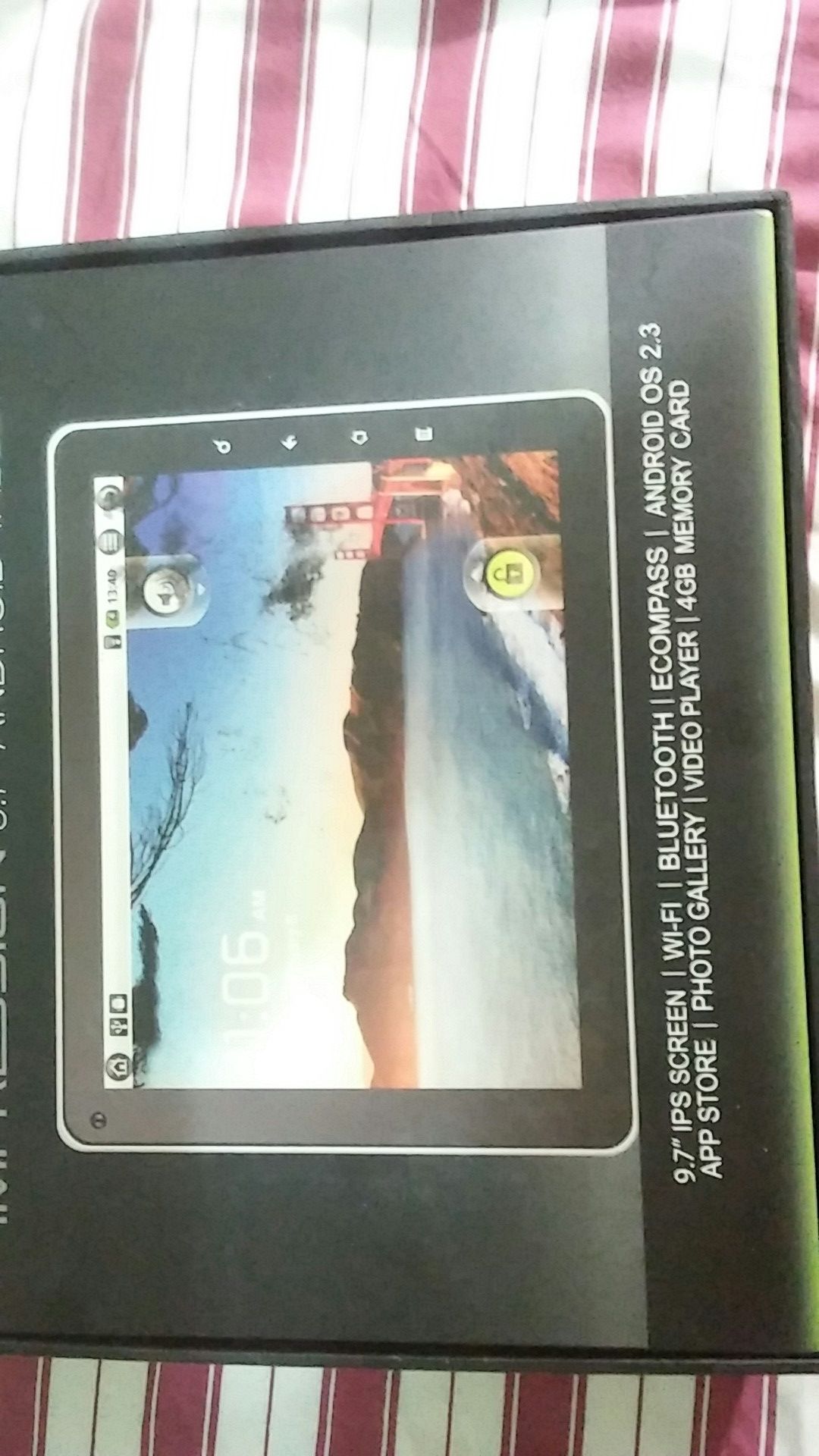 This is a like new Impression tablet in the original box. The tablet has a 9.7" ips screen, WIFI, blutooth, ecompass, android os 2.3, app store, photo gallery, video player & 4gb memory card thats expandable.