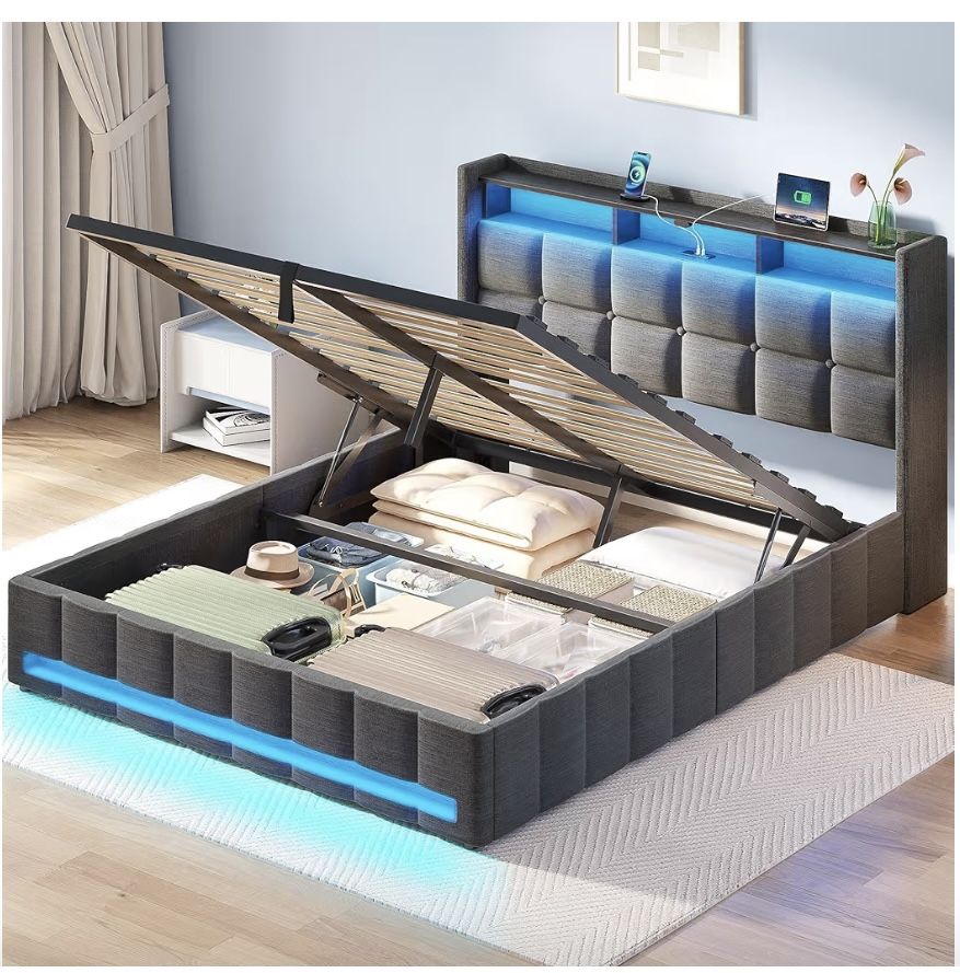 Brand new full size bed with storage and lights and charger still in the box never assembled no mattress included