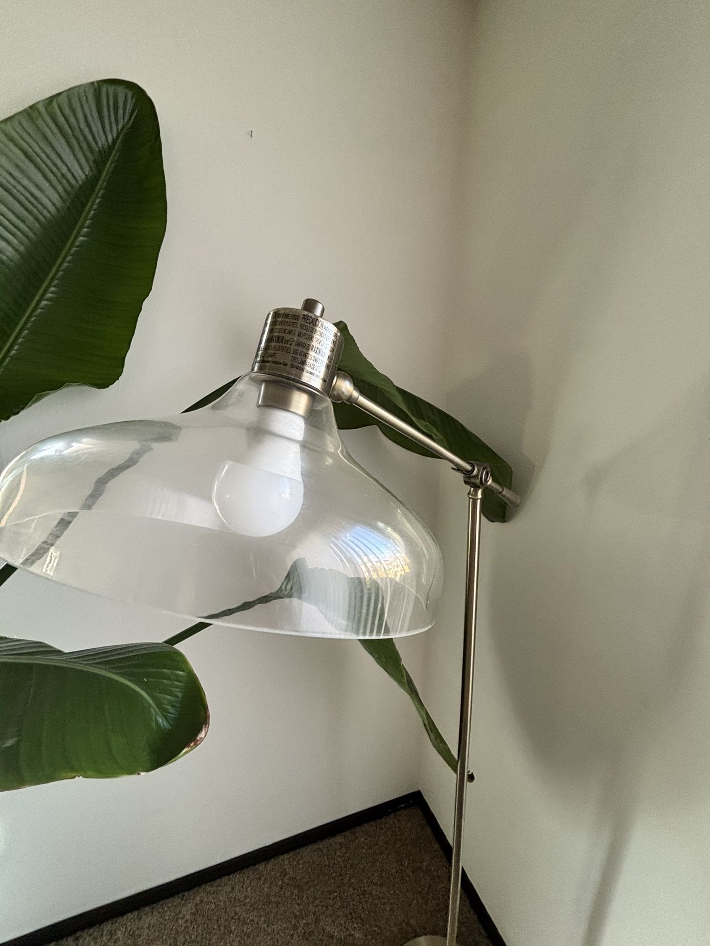 Classic floor lamp with a modern twist, specifically featuring a "boom arm" or "crane" design and a glass cloche shade.