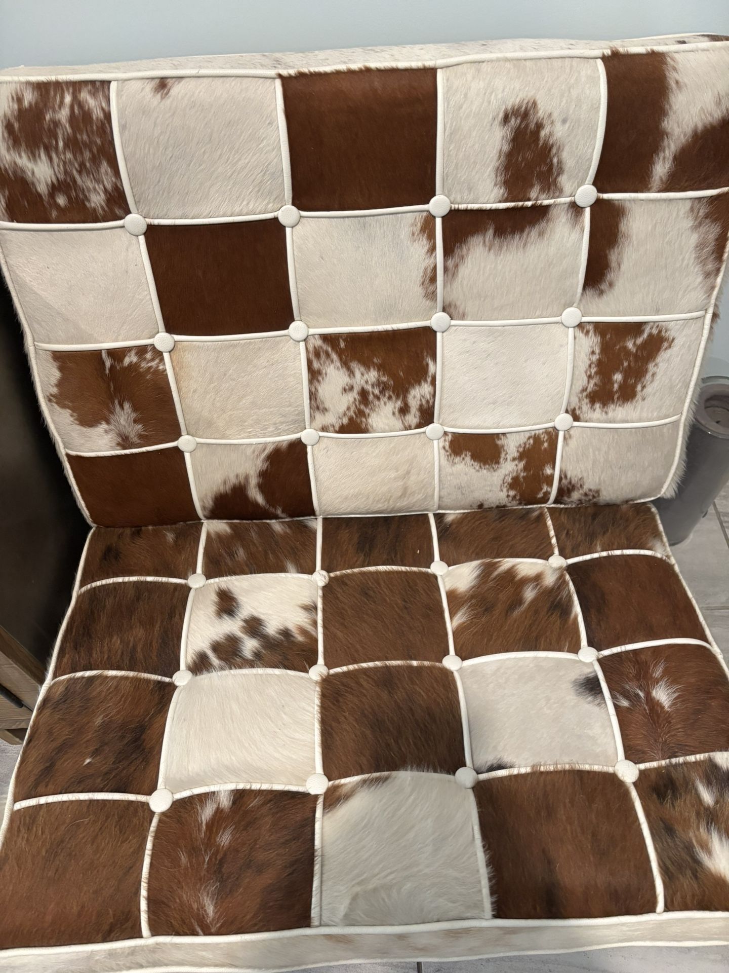 Cow print chair, no damage, excellent condition sold wirh white leather ottoman, also no damage, excellent condition.