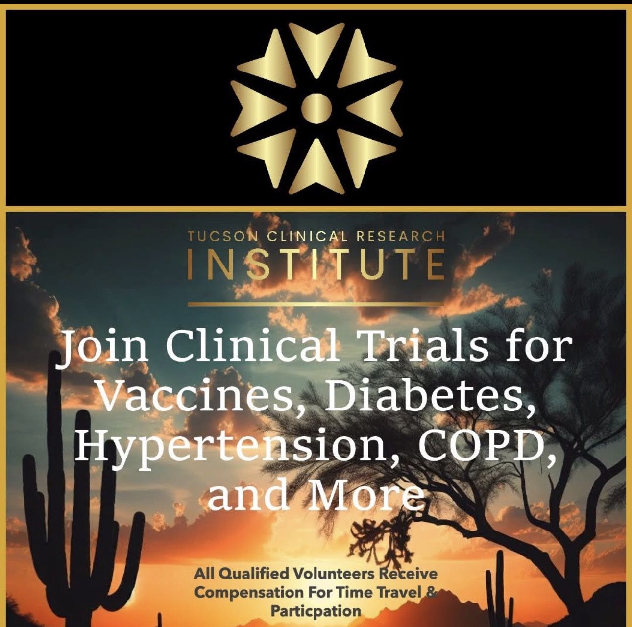Tucson Clinical Research Institute is actively seeking volunteers for the following studies: -COPD -Fall Flu Vaccine (healthy participants) -Type 2 Diabetes -Asthma -High blood pressure with Type 2 Diabetes Those who qualify will receive study related care and medications at no cost for the duration of the study. Compensation is provided for your time, travel, and participation up to $3,500 (depending on the study). Paid on a per visit basis. Interested? Feel free to contact us via phone to see if you qualify at (contact info removed) 6290 E Grant Road, Tucson AZ 85712 (Across the street from Costco)