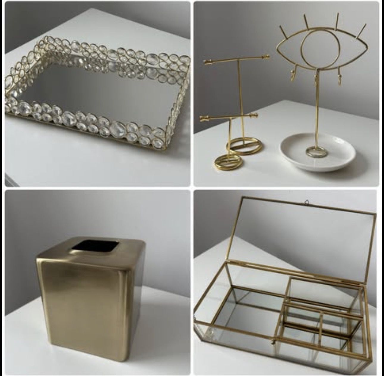 Everything $20. Pickup on Roosevelt Island. Gold decor items for sale in great condition — includes mirror tray, jewelry holder, glass box, and tissue box. Perfect for vanity, dresser, or bathroom styling. Can sell items separately (message me for prices).