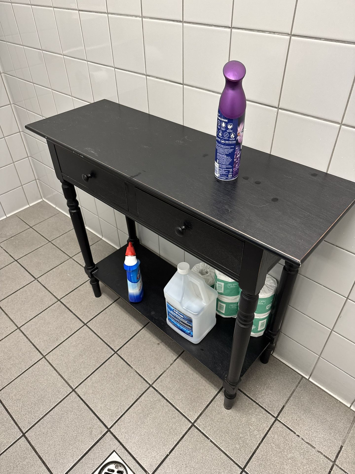 Black side table with two drawers Has some scratches & scruffs but in great condition otherwise 13"D x 37.8"W x 31.9"H