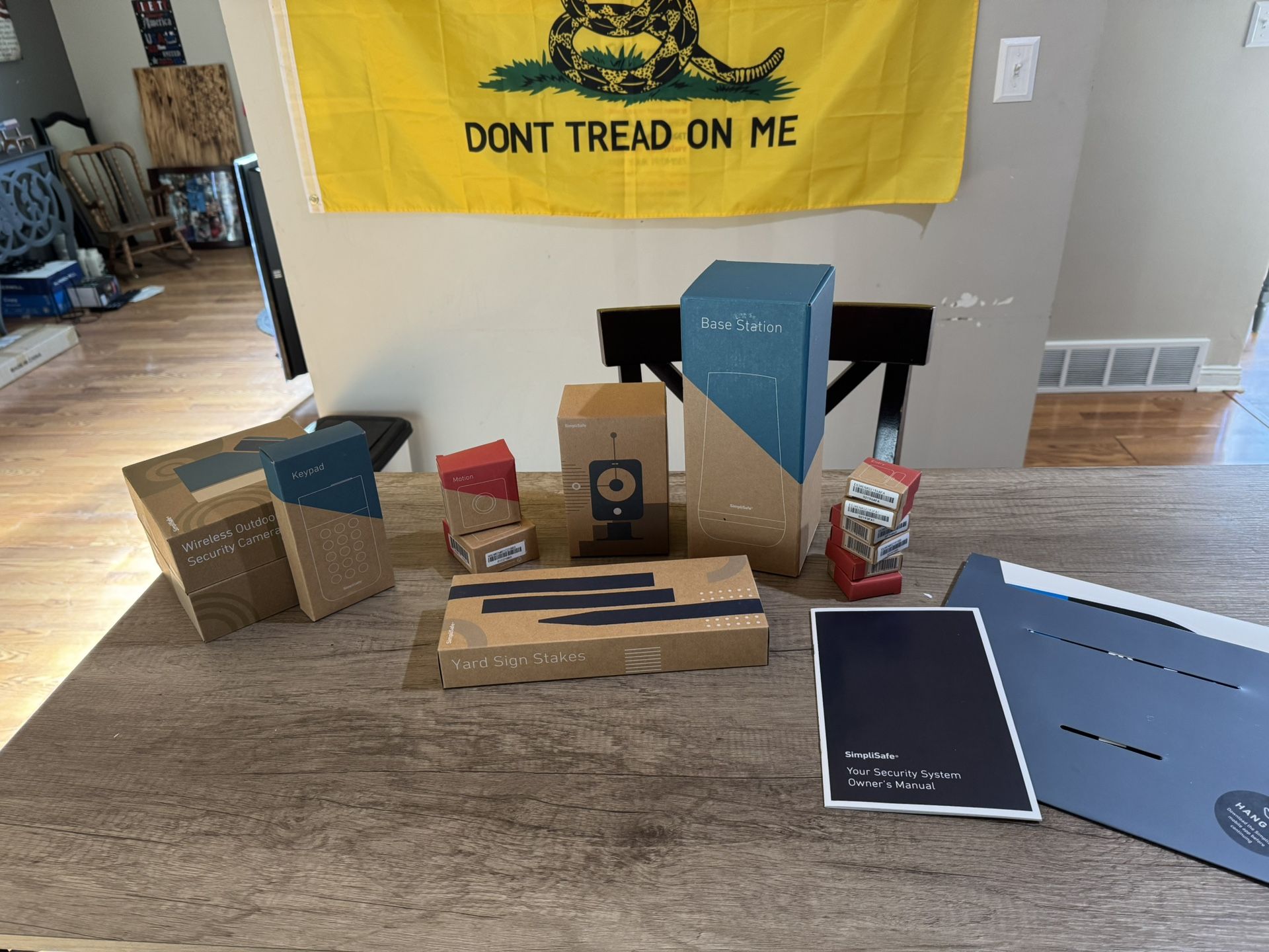 simply safe security system includes wireless outdoor camera, keypad, 2 motion sensors, , one simply camera, base station, yard sign stakes, and 6 entry devices. All new in box retails for $600. Monthly subscription is between 40/50 dollars a month.